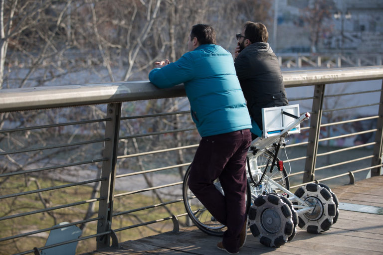 «Σιγά-σιγά το νέο σπίτι έπαιρνε μορφή. Η εσωτερική αναβαθμίδα εξαλείφθηκε, οι πάγκοι στην κουζίνα μπορούσαν να αυξομειώσουν το ύψος τους, τα ερμάρια μπορούσαν να πλησιάσουν κι εκείνα χαμηλά, τα ρούχα στις ντουλάπες να έρχονται πιο κοντά, τα μπάνια έγιναν πιο φιλικά. Κάτι όμως εξακολουθούσε να μην λειτουργεί όπως το θέλαμε. Αυτό φάνηκε γρήγορα όταν τα υπόλοιπα μέλη της οικογένειας δυσκολευόντουσαν εν μέρει να λειτουργήσουν στο ίδιο σπίτι μετά τις αλλαγές. Για το ίδιο δε το άτομο με την αναπηρία, όταν έβγαινε εκτός σπιτιού, όλα εξακολουθούσαν να είναι περίπλοκα. Έτσι λοιπόν, παρατηρώντας το δομημένο περιβάλλον και τις ειδικότερες απαιτήσεις των ατόμων με κινητικά προβλήματα, τολμήσαμε να αντιστρέψουμε το ζητούμενο και αντί να προσπαθούμε να κατεβάσουμε όσα περισσότερα πράγματα μπορούσαμε στο ύψος των καθήμενων χρηστών των αναπηρικών αμαξιδίων σκεφτήκαμε να ανεβάσουμε τους ίδιους στο ύψος της καθημερινότητας.»
