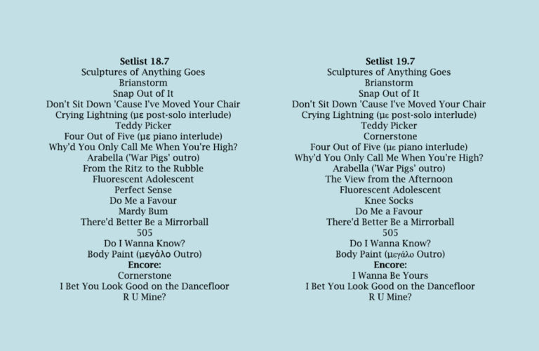 To setlist είχε έναν βασικό σκελετό που διατηρήθηκε και τις δύο μέρες αλλά με μερικές διαφοροποιήσεις και ειλικρινά σκέφτομαι πως αν δεν είχα καταφέρει να πάω και τις δύο μέρες, στάνταρ τώρα θα έκλαιγα που κάτι έχασα. Η μία μέρα είχε Mardy Bum ενώ η άλλη το Knee Socks και αντιστοίχως την πρώτη ακούσαμε το From the Ritz to the Rubble ενώ τη δεύτερη τη θέση του πήρε το The View From the Afternoon. Το Cornerstone που την πρώτη μέρα ήταν στο encore, τη δεύτερη παίχτηκε νωρίτερα, έφυγε εντελώς από τη λίστα το Perfect Sense και το encore ξεκίνησε με το I Wanna Be Yours το οποίο επάξια κερδίζει μια από τις τοπ στιγμές του διημέρου.