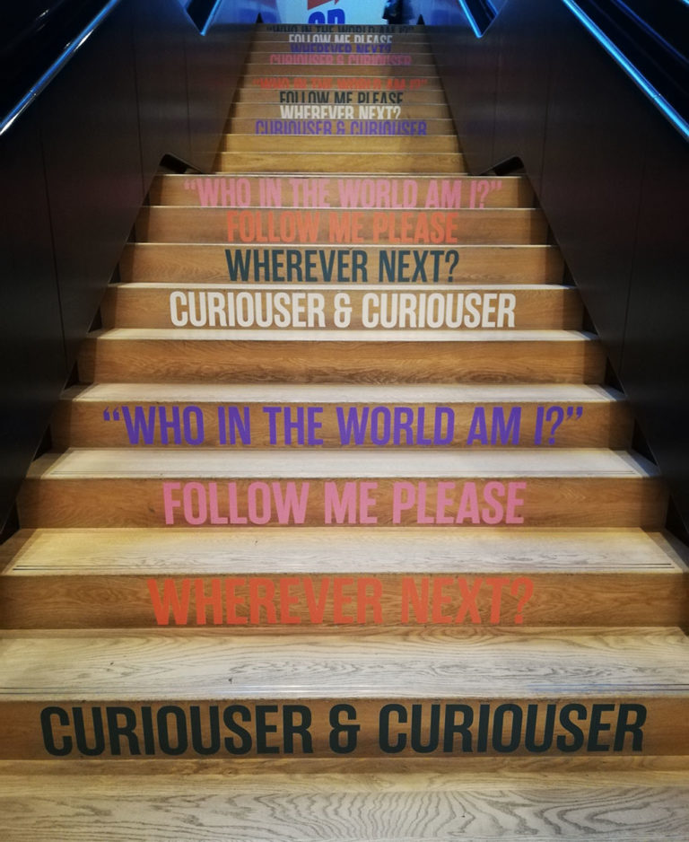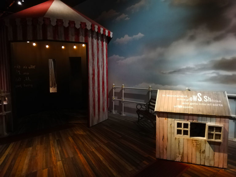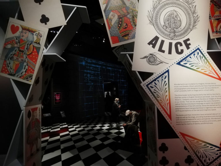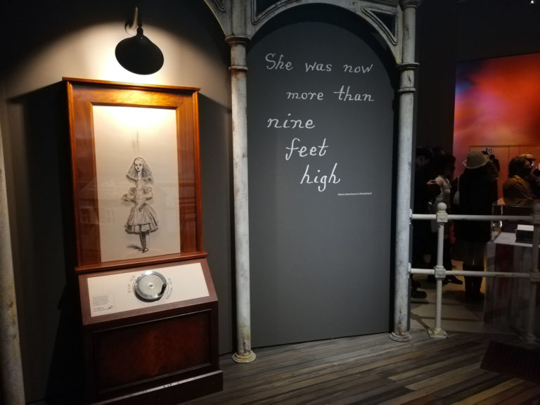 Η μεγάλη έκθεση του Μουσείου Victoria & Albert, “Alice: Curiouser and Curiouser” είναι μία πραγματική γιορτή για το θρυλικό αυτό “παιδικό” βιβλίο, με πάνω από 300 αντικείμενα, όπως χειρόγραφα, εικονογραφήσεις, φωτογραφίες, κοστούμια θεάτρου και μπαλέτου, ταινίες και πίνακες ζωγραφικής, απλωμένα σε πέντε θεματικές αίθουσες. Μία συναρπαστική βουτιά στη λαγουδότρυπα, από τις απαρχές της ιστορίας της Αλίκης, μέχρι τις μυριάδες προσαρμογές και ερμηνείες που έχει δει ο κόσμος μέσα σε αυτά τα 150 χρόνια. Το ταξίδι ξεκινά εκεί όπου ο Carroll είπε για πρώτη φορά την ιστορία του, «ένα χρυσό απόγευμα». Φωτογραφίες της σχολής της Οξφόρδης καλύπτουν τους τοίχους, υπό τον ήχο του νερού που χτυπάει πάνω σε ένα κουπί. Σε ένα ντουλάπι βρίσκεται το αρχικό χειρόγραφο του Carroll.