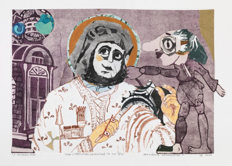 Όταν ο Καραγκιόζης αστειεύτηκε με τον Άγιο. 35.8Χ24 εκ. οξυγραφία, ραφή, 2020. Χριστόφορος Κατσαδιώτης.