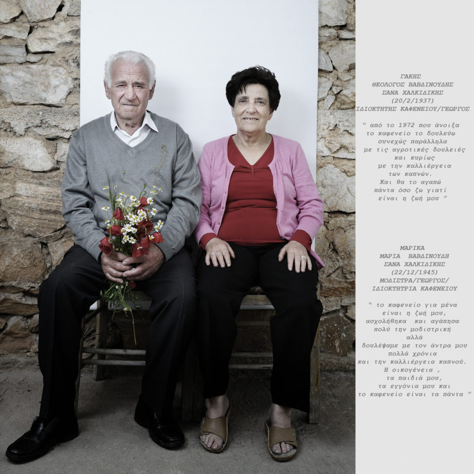 Πώς γεννήθηκε η ιδέα του συγκεκριμένου project που θέτει στο επίκεντρό του ένα Καφενείο του 1972 και ποια η προσωπική σύνδεση μαζί του; Στο poject επικεντρώθηκα σε ένα κομμάτι της ελληνικής παράδοσης, στο καφενείο των γονιών μου, που λειτουργεί ανελλιπώς επί 45 χρόνια στα Σανά Χαλκιδικής από το 1972, όταν και γεννήθηκα. Θέλησα να δημιουργήσω ένα επετειακό αφιέρωμα το οποίο να απεικονίζει τον τρόπο με τον οποίο οι θαμώνες περνούν τις ώρες τους στον χώρο του Καφενείου από το ξεκίνημά του μέχρι και σήμερα. Το project παρουσιάζει πορτραίτα των ιδιοκτητών του καφενείου –και γονιών μου– καθώς και των θαμώνων που συχνάζουν σε αυτό από το 1972 και έχουν καταφέρει να αναπτύξουν μεταξύ τους ανά τα χρόνια μία σχέση διαδραστική. Σε κάθε φωτογραφία αναφέρεται το όνομα του ανθρώπου, η ημερομηνία γέννησης, το επάγγελμα σε ορισμένες περιπτώσεις, καθώς και μία φράση για το τι σημαίνει το καφενείο γι’ αυτόν. Άνθρωποι με μια μυρωδιά αυθεντικότητας, ειλικρίνειας και αλήθειας. Δε μπορώ να ξέρω αν η φωτογράφιση έγινε συνειδητά, γιατί τα βιώματά μας βγαίνουν με διάφορους τρόπους στην επιφάνεια. Αυτό που ξέρω σίγουρα είναι ότι πρόκειται για ένα αποτέλεσμα της επαγγελματικής μου επάρκειας ως φωτογράφου και της προσωπικής μου θέσης των πραγμάτων με σύμμαχο το φωτογραφικό μέσο. Απέφυγα τον εσωτερικό χώρο για την φωτογράφιση, καθώς ο εξωτερικός πέτρινος τοίχος, υπάρχει αναλλοίωτος από την πρώτη μέρα της λειτουργίας του καφενείου, αποτελώντας τη βάση, τον λίθο της αφήγησης. Η τυπολογία ολοκληρώθηκε με την χρήση του λευκού φόντου, με αποτέλεσμα το κάθε πορτραίτο να παραμένει ακέραιο. Στις φωτογραφίες που προέκυψαν, δεν υπάρχει κανένας εννοιολογικός λαβύρινθος αλλά ούτε κάποιο νοσταλγικό πρόσημο. Τα πρόσωπα και οι λέξεις τους, αυτά θα περιγράψουν το καφενείο με τρόπο βιωματικό, πιθανόν να απαντήσουν σε ερωτήματα για την πορεία μου ως άνθρωπος και φωτογράφος. Ακόμη, η δημιουργία μελλοντικά μιας εγκατάστασης-έκθεσης στον εξωτερικό υπαίθριο χώρο του καφενείου, για να υπάρχει μια αμεσότητα και να ξεφύγουμε από τα όρια των τοίχων και του χώρου, θα ήταν ιδανική.