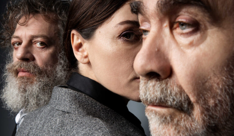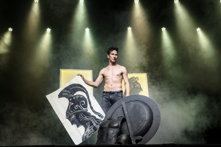 Την ώρα που ο Μιχάλης Σαράντης γδύνεται ερμηνεύοντας και τους εννιά ρόλους της τραγωδίας του Σοφοκλή, ο Απόστολος Χαντζάρας ανοίγει «διάλογο» μαζί του ζωγραφίζοντας τους χαρακτήρες σε πορτραίτα και γεμίζοντας τη σκηνή με αυτά. Έχε στο μυαλό σου αυτό για αρχή. Για συνέχεια δεν θα έχεις τίποτα λιγότερο από ένα ερμηνευτικό masterpiece του υπερταλαντούχου ηθοποιού που βρίσκει εμφανέστατα στις σκηνοθετικές κατευθύνσεις του Γιώργου Νανούρη την ασφάλεια που χρειάζεται για να ξεδιπλώσει τις ιστορίες του. Και το αδιανόητα παλλόμενο από τα πάθη των ηρώων σώμα του.
