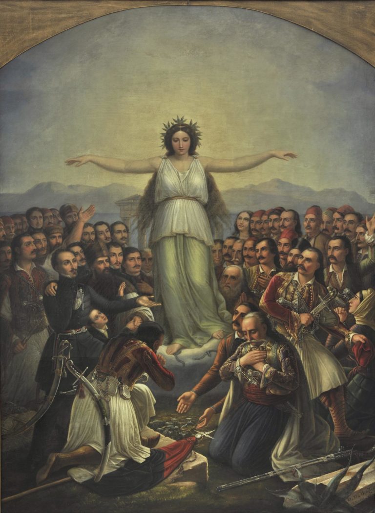 Ένα έργο με ιδιαίτερο συμβολισμό και μεγάλη φήμη, «Η Ελλάς ευγνωμονούσα» του Θεόδωρου Βρυζάκη, απεικονίζει την Ελλάδα ως αρχαία κόρη, πάνω σ’ ένα σύννεφο που την κρατά υπερυψωμένη και κυρίαρχη στο κέντρο του πίνακα. Φορά δάφνινο στεφάνι στα ξέπλεκα μαλλιά της, ενώ τα χέρια της είναι απλωμένα δεξιά και αριστερά, σε μία συμβολική κίνηση εναγκαλισμού. Γύρω της συνωστίζονται οι γνώριμοι πρωτεργάτες της Επανάστασης, οι πρόδρομοι Ρήγας Φεραίος, Αδαμάντιος Κοραής, Αλέξανδρος Υψηλάντης, Μιχαήλ Σούτζος, οι αγωνιστές Θεόδωρος Κολοκοτρώνης, Γεώργιος Καραϊσκάκης, Οδυσσέας Ανδρούτσος και οι ήρωες των ναυτικών αγώνων Κωνσταντίνος Κανάρης, Ανδρέας Μιαούλης, Λασκαρίνα Μπουμπουλίνα.