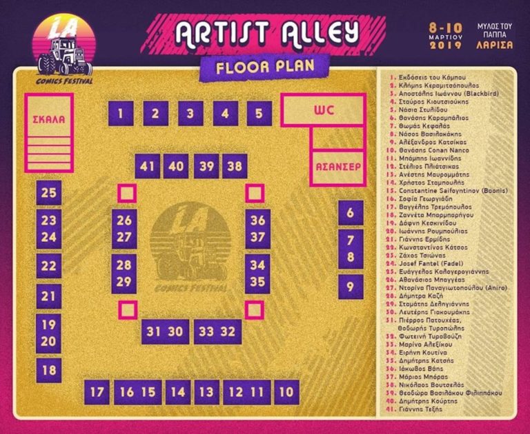 50 καλλιτέχνες από όλη την Ελλάδα δίνουν το παρόν στα τραπέζια και στις εκθέσεις της διοργάνωσης, προβάλλοντας µια µεγάλη ποικιλία εικονογραφήσεων, αυτοεκδόσεων και κόµικς εντύπων. Το κοινό θα έχει την ευκαιρία να περιηγηθεί στις εκθέσεις που θα φιλοξενούνται στο χώρο, µεταξύ των οποίων και µία έκθεση κόµικ και εικονογράφησης µε τίτλο «Μονοσέλιδα», αποτελούµενη από έργα 40 Ελλήνων και Κυπραίων δηµιουργών κόµικς. Επιπλέον, το LAComicsFestival θα φιλοξενεί και µία Έκθεση σπάνιων ελληνικών συλλεκτικών κόµικς καθώς και επιτραπέζια παιχνίδια (σε συνεργασία µε το Play House) ενώ στο χώρο του φεστιβάλ θα υπάρχει bazaar βιβλίων κόµικς από καταστήµατα και εκδοτικούς οίκους.