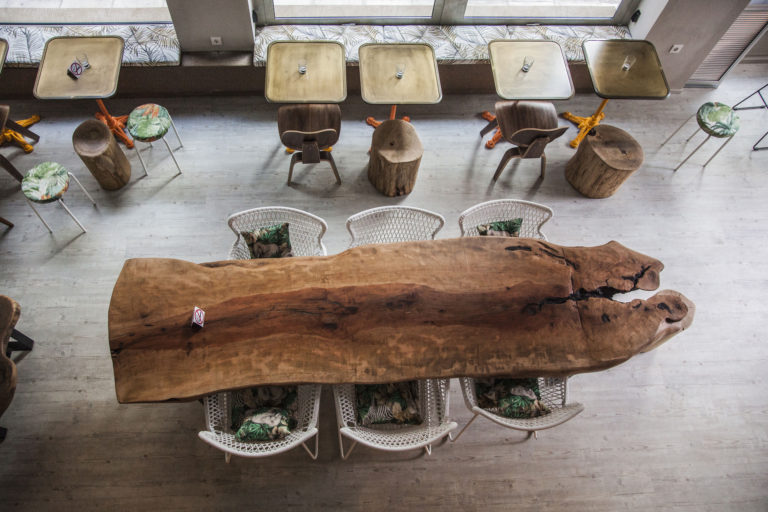 Η διακόσμηση του χώρου έχει αναφορές στα meerkat, στα χρώματα της ερήμου, στην Αφρική και σε ένα exotic colonial στυλ που είναι διάχυτο παντού. Η μετόπη στην είσοδο του μαγαζιού παραπέμπει σε τυπικό αποικιακό σπίτι στην Αφρική, ένα μεγάλο μοναστηριακό τραπέζι από ξύλο αχλαδιάς στο κέντρο, ένα μικρότερο στο βάθος από ξύλο καρυδιάς μπροστά από το μοναδικό καναπέ του μαγαζιού, πάγκοι που «τρέχουν» γύρω από τις μεγάλες τζαμαρίες, λευκό ξύλινο πάτωμα και μια απίθανη ξύλινη μπάρα από ξύλο νιαγκόν (ένα δέντρο που ευδοκιµεί στην Αφρική). Τα μαξιλάρια συμπληρώνουν τον περιρρέον εξωτισμό (ο οποίος όμως έχει ταυτόχρονα μια minimal βάση και σε καμία περίπτωση δεν ρέπει προς το μαξιμαλιστικό εξωτισμό που είναι πια παγκόσμια διακοσμητική τάση/σούπα λέγε με και pink flamingo-ακόμα-και-στα-καφενεία) με μορφές από ελέφαντες και ζώα της Αφρικής, ενώ το soundtrack το οποίο έχει επιμεληθεί εξ ολοκλήρου η Όλγα Κουκλάκη είναι μια υπνωτική tribal electronica με (ανά διαστήματα) ήχους ζώων στο background δημιουργώντας μια απόκοσμη αίσθηση που συνδυάζεται τέλεια με τις προβολές από τα ντοκιμαντέρ του Animal Planet από τις «περιπέτειες» των meerkat στις αφρικανικές ερήμους.