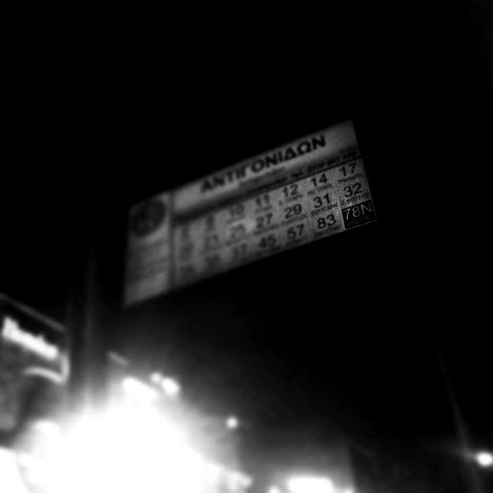 78Ν, του πιο θρυλικού νυχτερινού λεωφορείου της Ελλάδας. Από τις 22.30 μέχρι τις 05.30 και ιδίως στο διάστημα μεταξύ 02.00 και 04.00, το 78Ν («Ν» από το «Νυχτερινό») είναι το ιδανικό μπαράκι για να μιλήσεις, να φλερτάρεις, να ακουμπήσεις τους άλλους με κάθε σημείο του σώματός σου, να σταθείς σε διαγώνια στάση, να νιώσεις ό,τι περίπου και σε μια μεγάλη ροκ συναυλία αλλά με το μπρος-πίσω ενός λεωφορείου που τρέχει στην