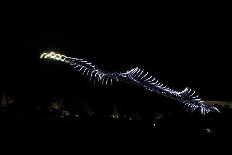 "Αντλώντας έμπνευση από τη βιοφωταύγεια και τη μυστήρια ζωή στα βάθη των ωκεανών, η εγκατάσταση Whale Galaxy συνδυάζει την πλεύση και τον μετεωρισμό, το φέγγος και την αντανάκλαση, δημιουργώντας μια φωτεινή εμπειρία που ισορροπεί ανάμεσα στη θάλασσα και το σύμπαν." Ένα εντυπωσιακό έργο-γλυπτό, μιια φωτεινή φάλαινα αιωρούμενη σε ένα ημι-αόρατο δίχτυ ανάμεσα στα ψηλά πεύκα, σε βυθίζει σε διαστρικά όνειρα, είτε του σκοτεινού σύμπαντος είτε του απροσπέλαστου ωκεάνειου βυθού.