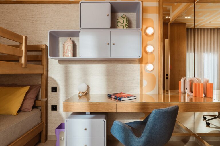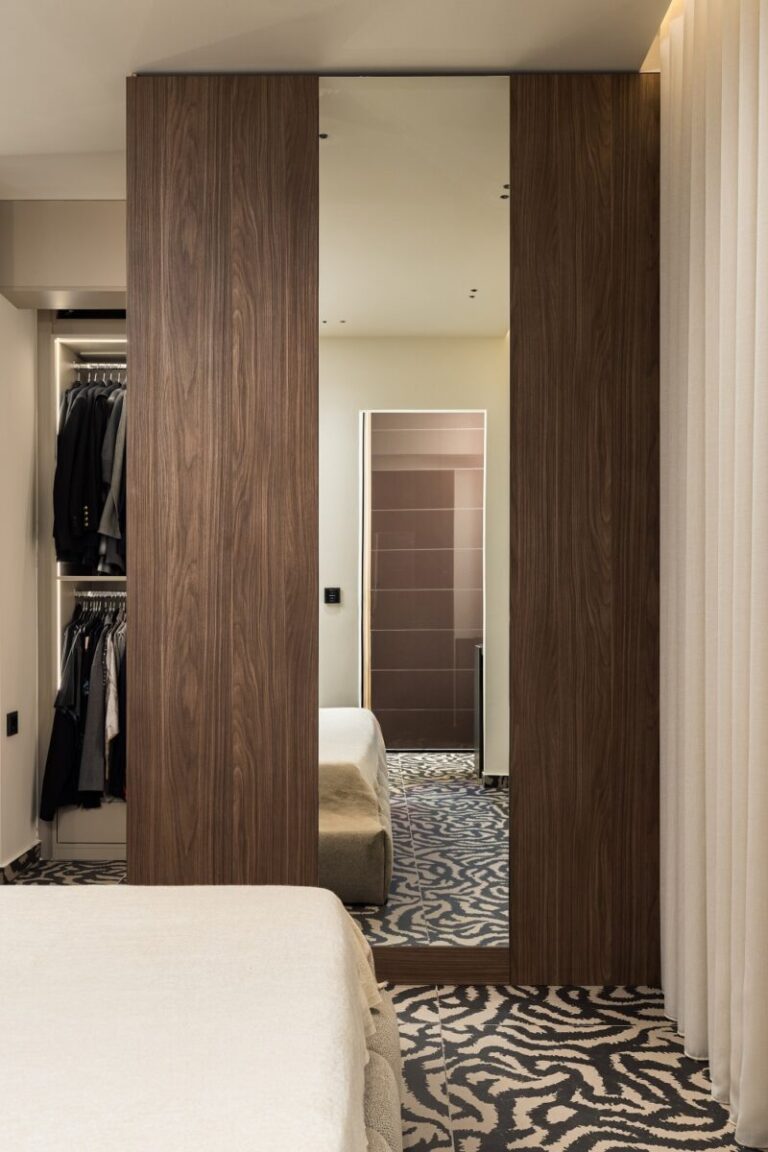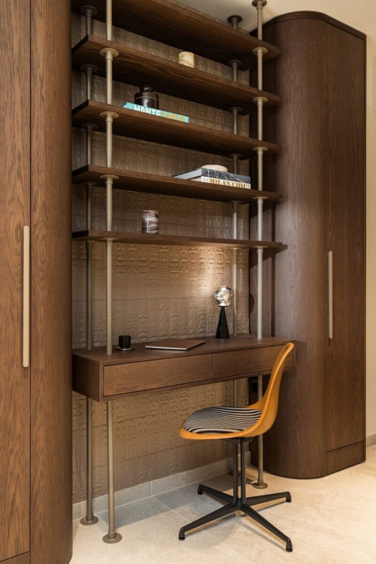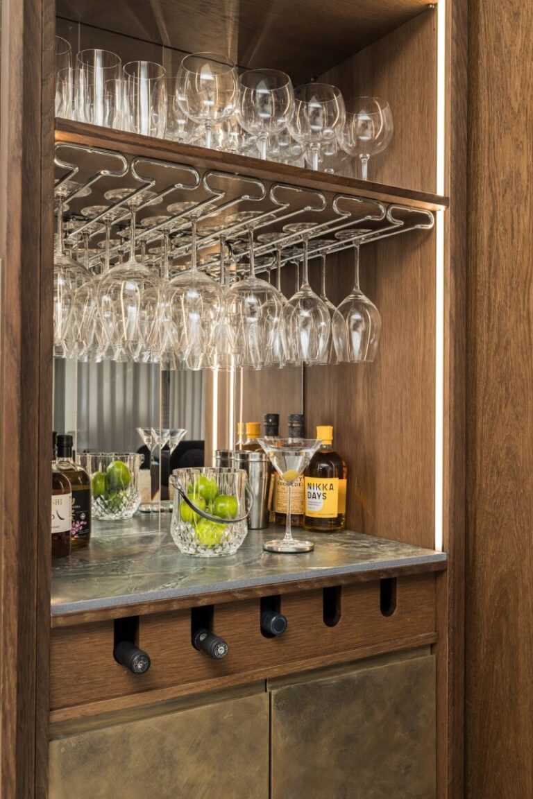 Το κρυφό μπαρ, και ένα μικρό γραφείο με αποθηκευτικούς χώρους συμμετρικά του για καθημερινή χρήση, ξεχωρίζουν για τον χαρακτήρα που προσδίδουν.