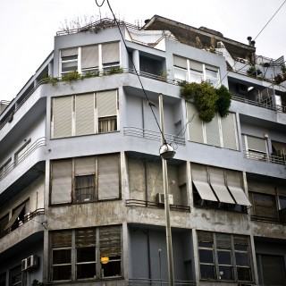 Στη συμβολή των οδών Αραχώβης και Θεμιστοκλέους, στην περιοχή των Εξαρχείων και πάνω στην πλατεία της, η Μπλε Πολυκατοικία χρονολογείται από το 1933. Αποτελεί ένα από τα πιο εμβληματικά δείγματα του ελληνικού μοντερνισμού και είναι το έργο για το οποίο είναι κυρίως γνωστοί οι δημιουργοί του, ο αρχιτέκτονας Κυριακούλης Παναγιωτάκος και ο ζωγράφος Σπύρος Παπαλουκάς. Είναι το κτίριο για το οποίο ο Λε Κορμπυζιέ κατά την επίσκεψή του στην Αθήνα σχολίασε "c' est tres beau" .