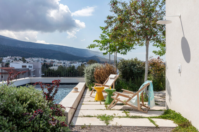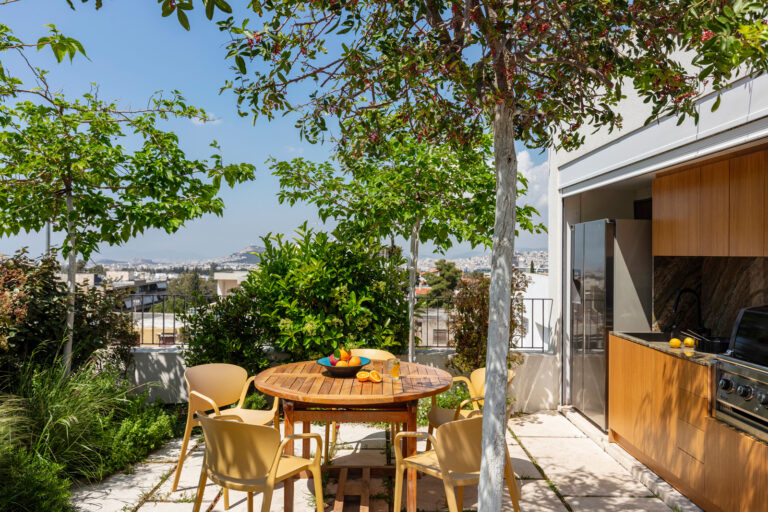 Το φυτεμένο δώμα αποτελεί τον βασικό χώρο συνάντησης: ένας υπαίθριος πυρήνας ζωής που φιλοξενεί κολύμβηση, μαγείρεμα και κοινά γεύματα, με πανοραμική θέα προς τον Υμηττό και τον αστικό ορίζοντα.