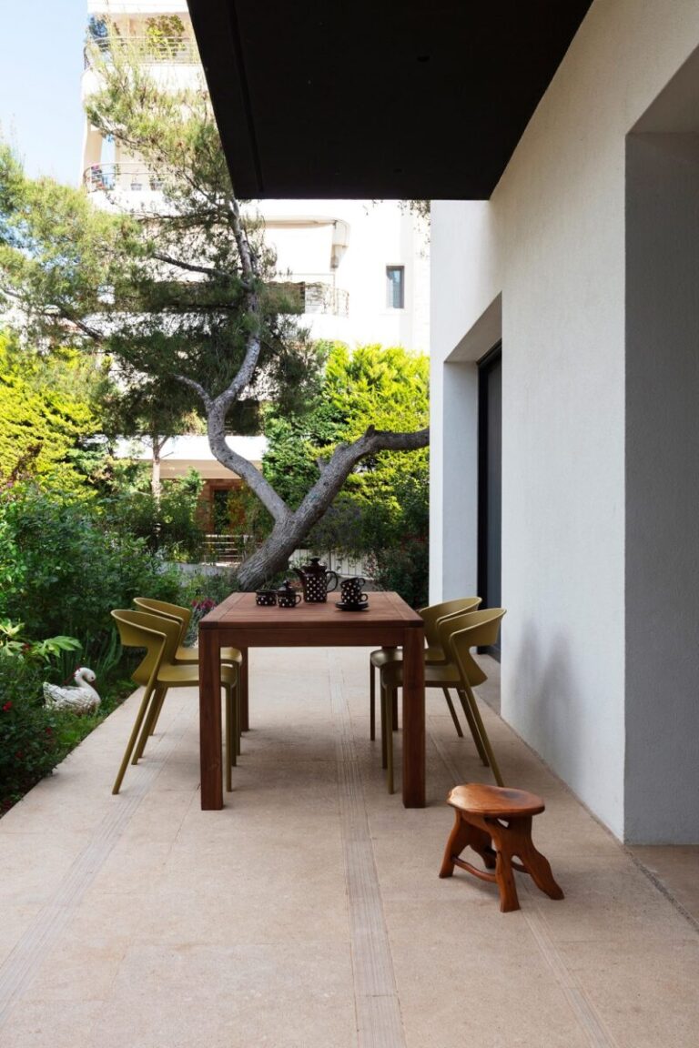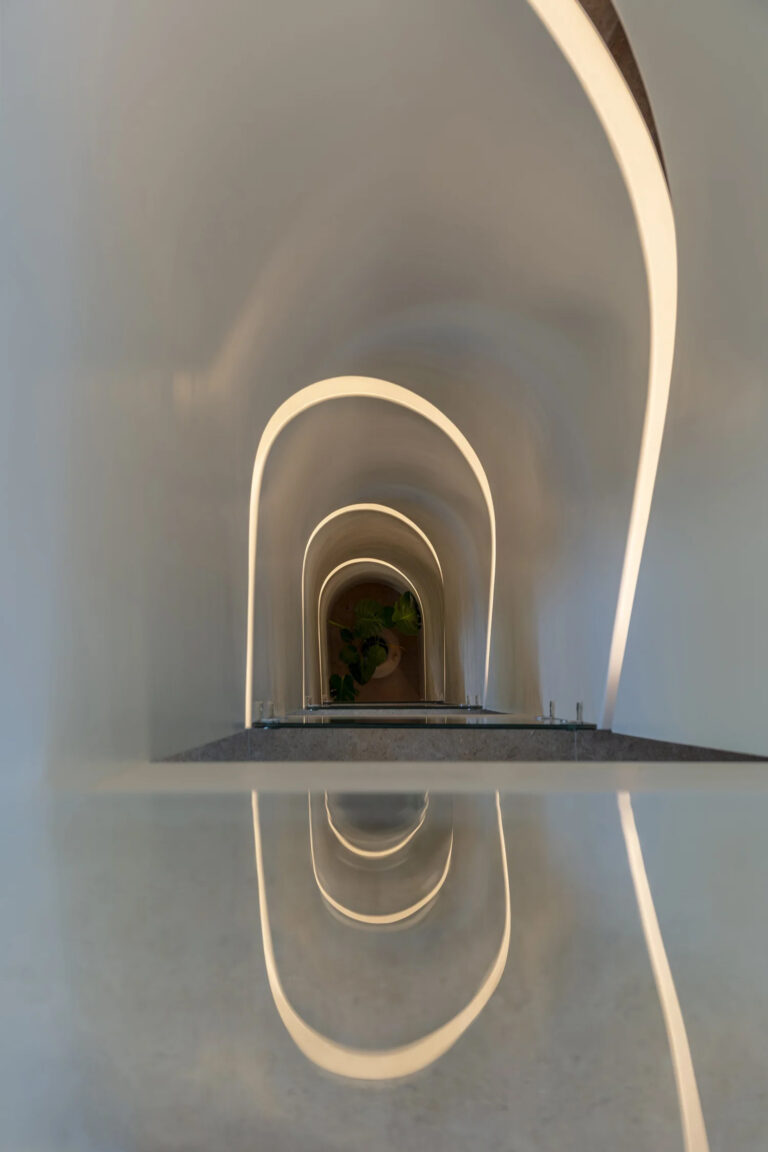 Δύο εξωτερικές κλίμακες συνδέουν την κύρια αυλή, τους εξώστες και το φυτεμένο δώμα με την κολυμβητική δεξαμενή, δημιουργώντας ένα συνεχές δίκτυο κίνησης και κοινής εμπειρίας σε όλα τα επίπεδα.
