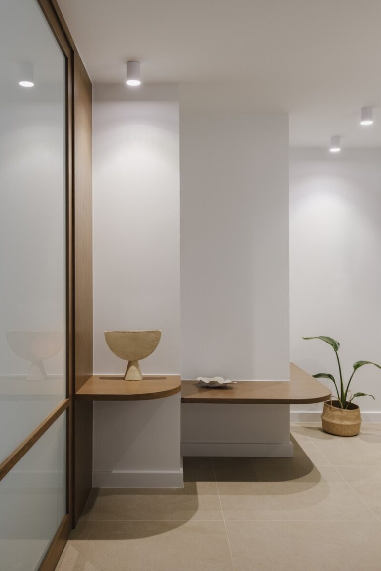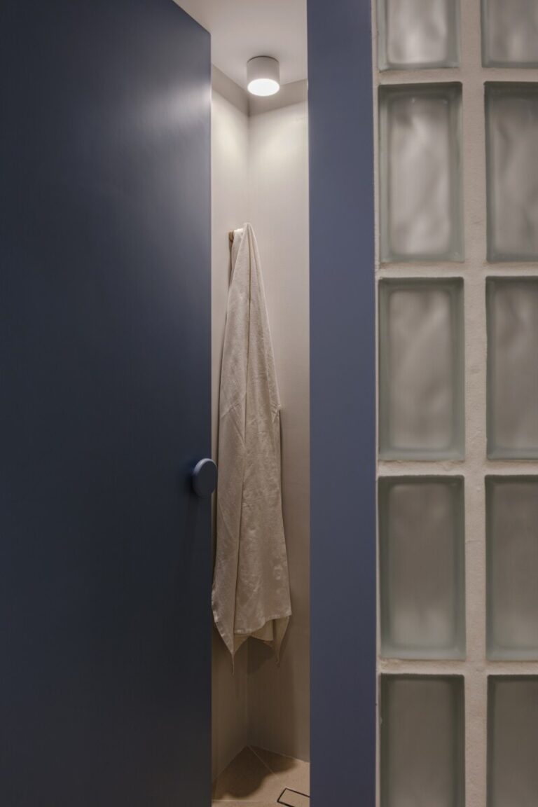 Η μη αναμενόμενη θέση του μπάνιου στην είσοδο του διαμερίσματος καταστρατηγήθηκε με τη χρήση ημιδιαφανούς υαλότουβλου και της καμπύλης γεωμετρίας που χαράχθηκε. Η δημιουργία του ορίου αυτού εντείνει και καθοδηγεί την κίνηση στους υπόλοιπους χώρους και τη διάχυση του φωτός.