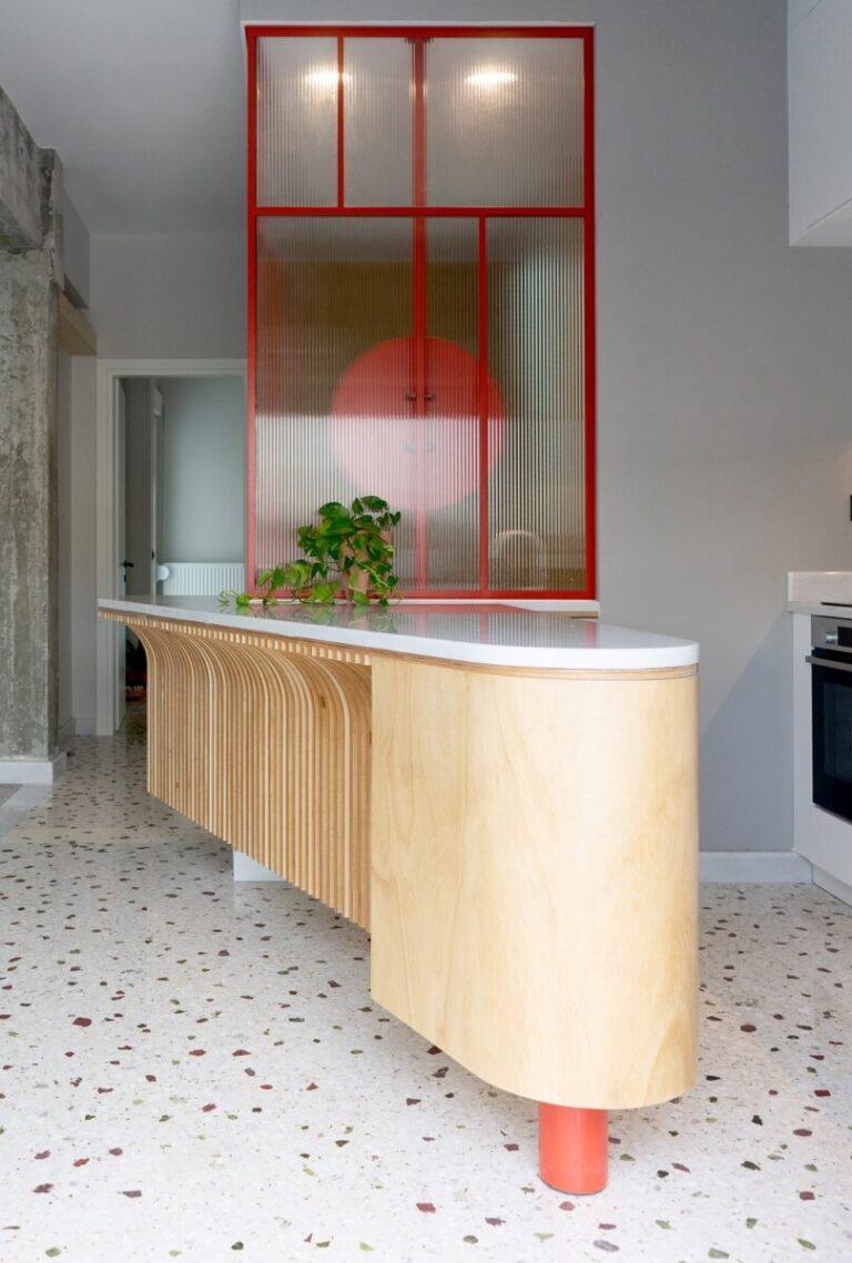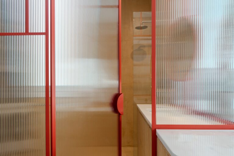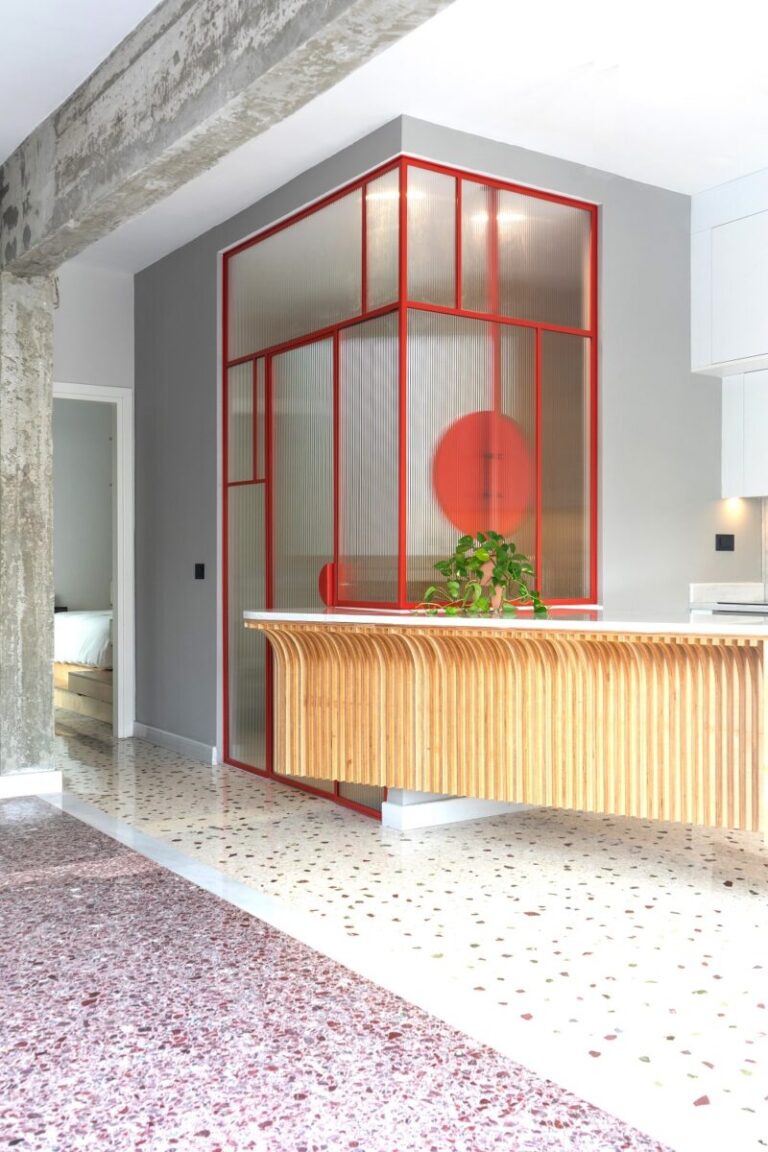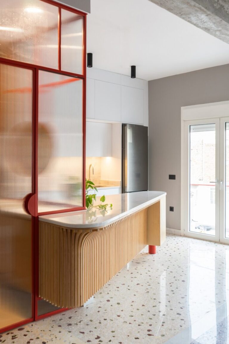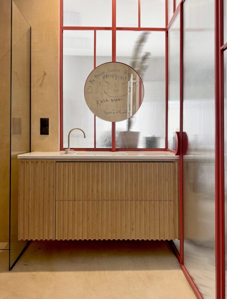 Η νησίδα συνεχίζεται στο λουτρό, όπου μετατρέπεται σε νιπτήρα, θολώνοντας τα όρια μεταξύ των χώρων. Η διάχυση του φυσικού φωτός μέσα από το αυλακωτό γυαλί διαπερνά ολόκληρο τον χώρο.