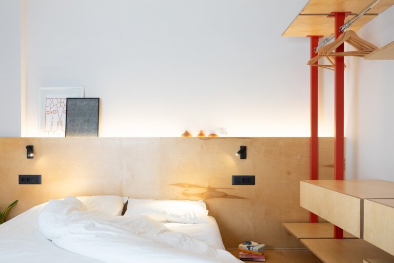 Στο πίσω τμήμα, το υπνοδωμάτιο λειτουργεί ως ευέλικτος χώρος χαλάρωσης. Το κρεβάτι, κατασκευασμένο από κόντρα πλακέ, τοποθετείται κατά μήκος του τοίχου, δημιουργώντας μια ενιαία καθαρή γραμμή που ενσωματώνεται αρμονικά στον χώρο.