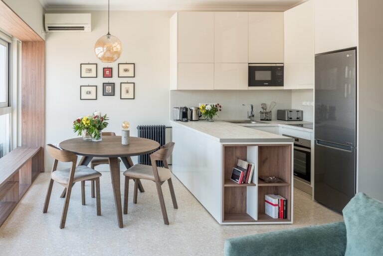 Με εμβαδόν μόλις 59 τ.μ., το διαμέρισμα έχει ανοιχτή διαρρύθμιση και κάθε γωνία αξιοποιήθηκε στο έπακρο με ειδικά σχεδιασμένα έπιπλα, χρησιμοποιώντας ειδικά φινιρίσματα. Διατηρώντας το κλασικό στοιχείο του μωσαϊκού δαπέδου, το ανοιχτόχρωμο ξύλο σε συνδυασμό με το ζεστό πράσινο χρώμα του καναπέ έρχεται να δώσει αίσθηση θαλπωρής.
