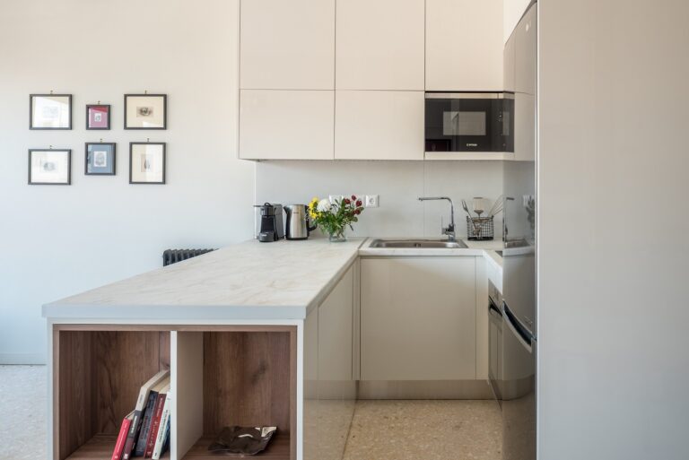 Η κουζίνα, έξυπνα διαρρυθμισμένη, ενσωματώνει όλες τις απαραίτητες λειτουργίες και εντάσσεται με κομψότητα στο σύνολο της επίπλωσης.