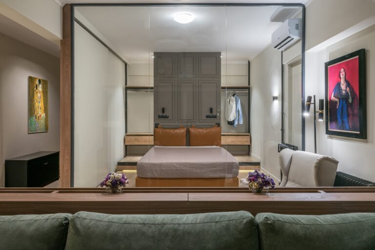 Τοποθετημένο σε υπερυψωμένο επίπεδο, το υπνοδωμάτιο έχει το πλεονέκτημα της ανεμπόδιστης θέας μέσα από τον γυάλινο τοίχο που το διαχωρίζει από τον υπόλοιπο χώρο.