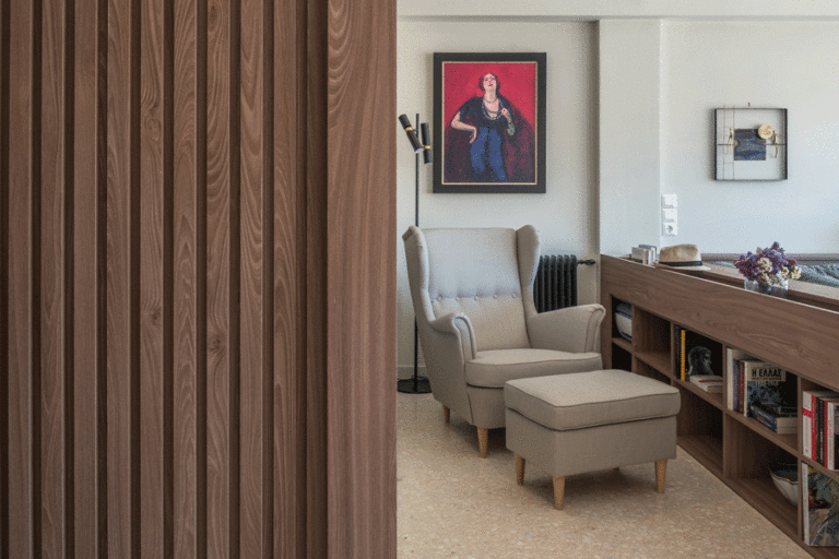 Η ειδική ξύλινη κατασκευή στο κέντρο του χώρου οριοθετεί με θέρμη το καθιστικό, ενώ δημιουργεί και μια ήσυχη γωνιά με βιβλιοθήκη και μπερζέρα για τη συλλογή βιβλίων και δίσκων του ζευγαριού.