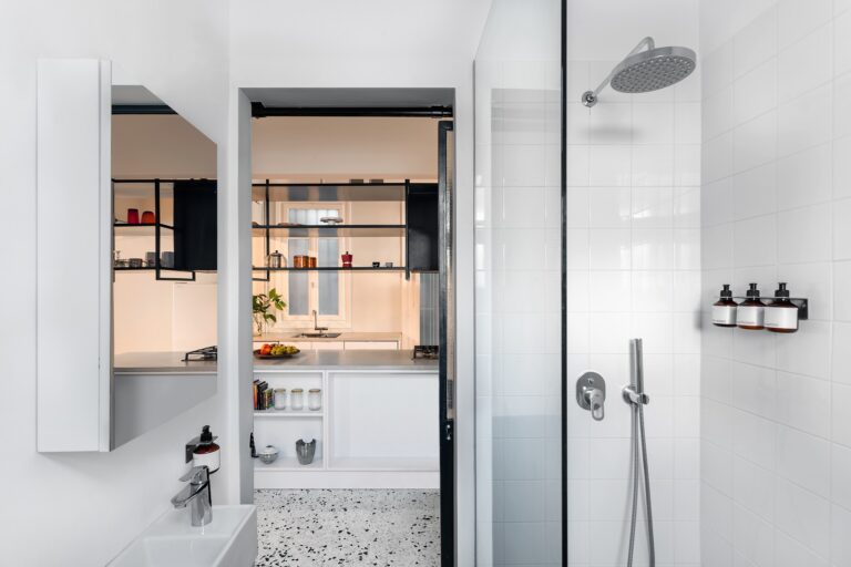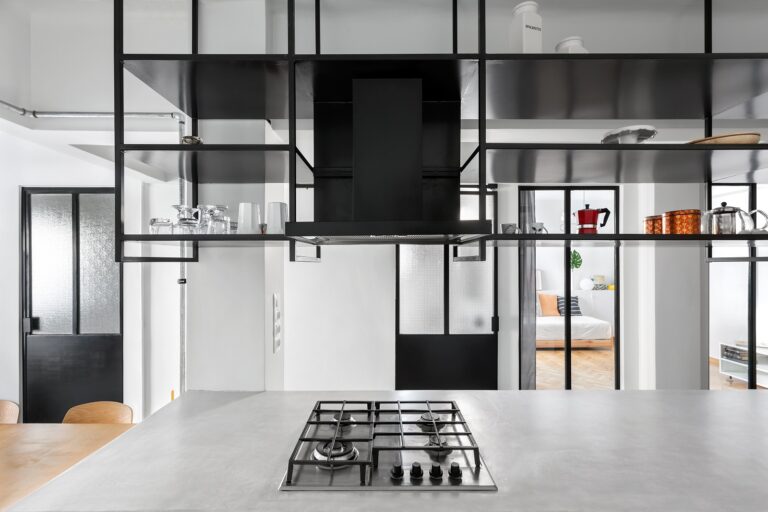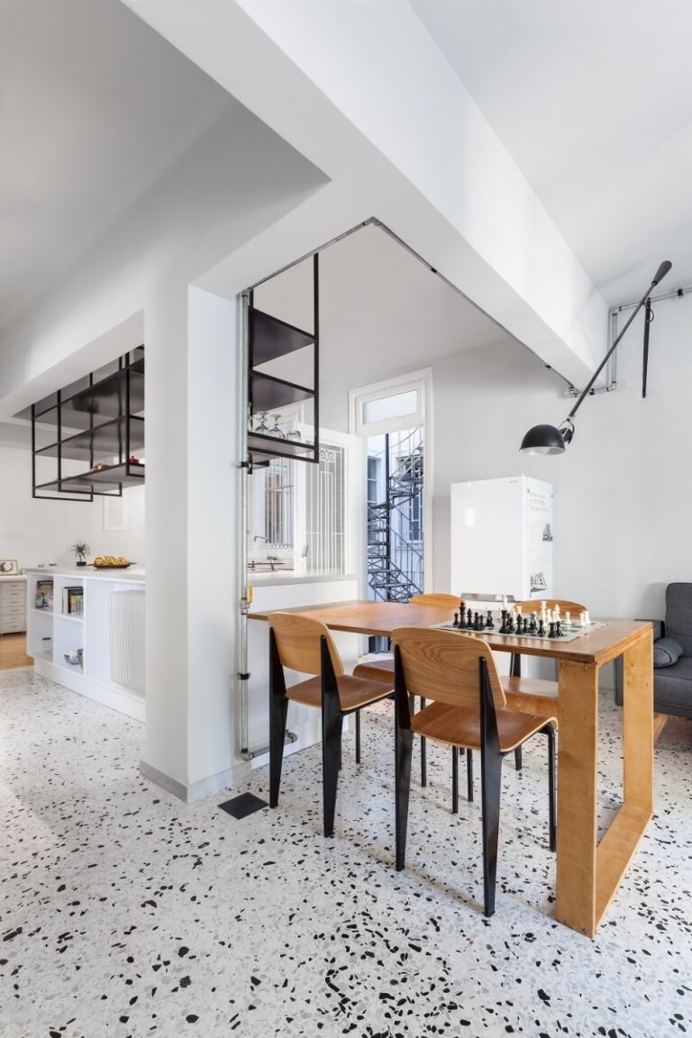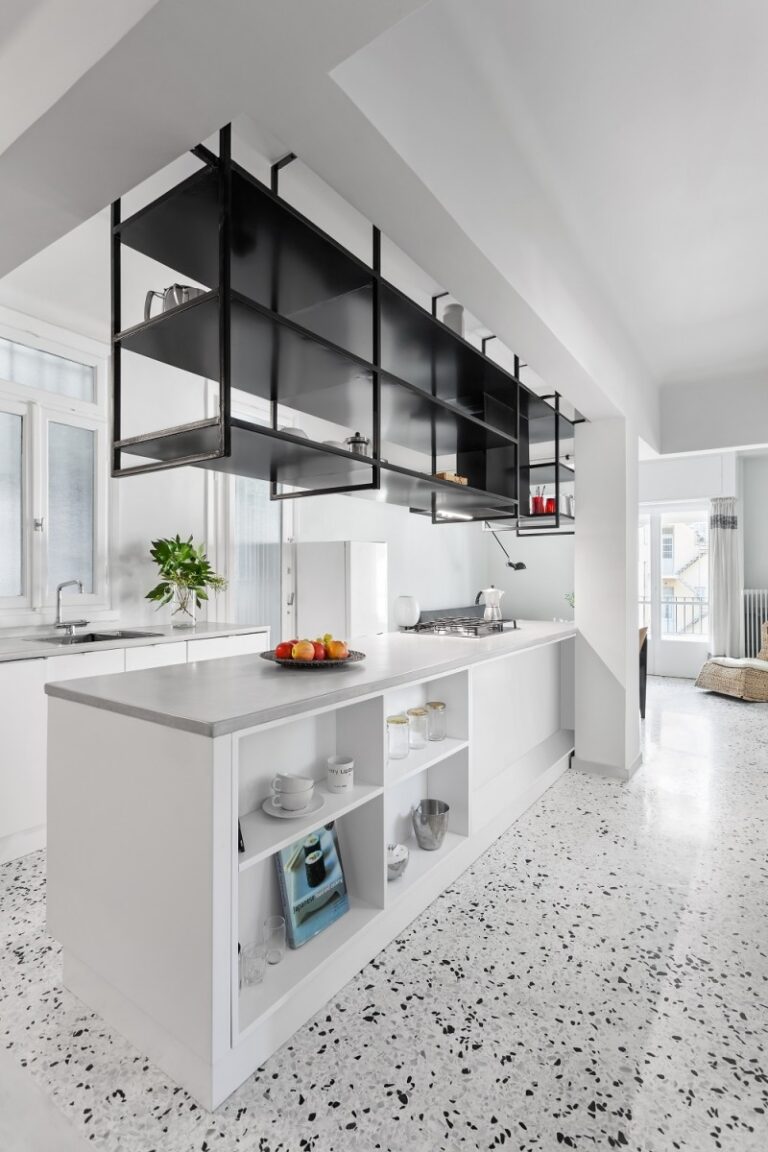 Τα νέα μεταλλικά στοιχεία που χρησιμοποιήθηκαν στα ράφια της κουζίνας και τις πόρτες με κρύσταλλο που αναπτύσσονται κατά μήκος του νέου συνθετικού άξονα, συμμετέχουν στην ενοποίηση του χώρου, ενώ δημιουργούν ένα διαμπερές φίλτρο όπου χρειάζεται.