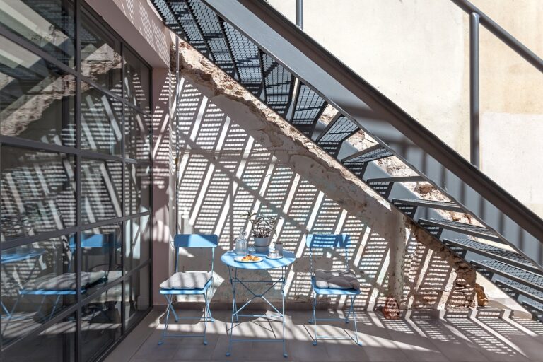 Η παλιά κτιστή σκάλα που οδηγούσε στην ταράτσα καταλάμβανε μεγάλο μέρος της εσωτερικής αυλής, περιορίζοντας τη χρήση της και εμποδίζοντας το φυσικό φως να μπει στο σπίτι.
