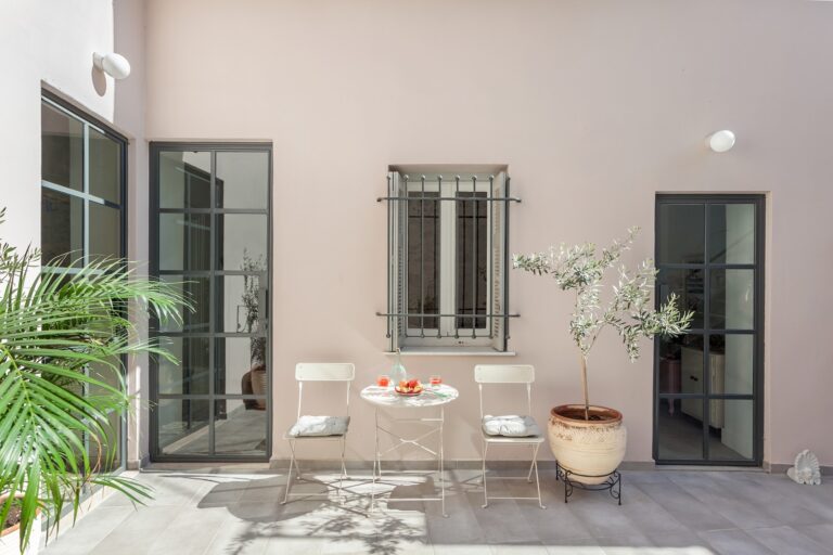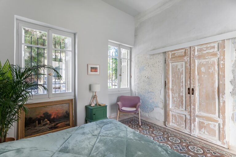 Στο υπνοδωμάτιο, τα αυθεντικά στοιχεία του σπιτιού αποκαλύπτονται ακόμα περισσότερο. Οι παλιές ξύλινες πόρτες, οι υφές των τοίχων και τα παραδοσιακά πλακάκια δημιουργούν μια ατμόσφαιρα που θυμίζει το παρελθόν του κτιρίου, ενώ τα σύγχρονα έπιπλα προσθέτουν άνεση και φρεσκάδα.