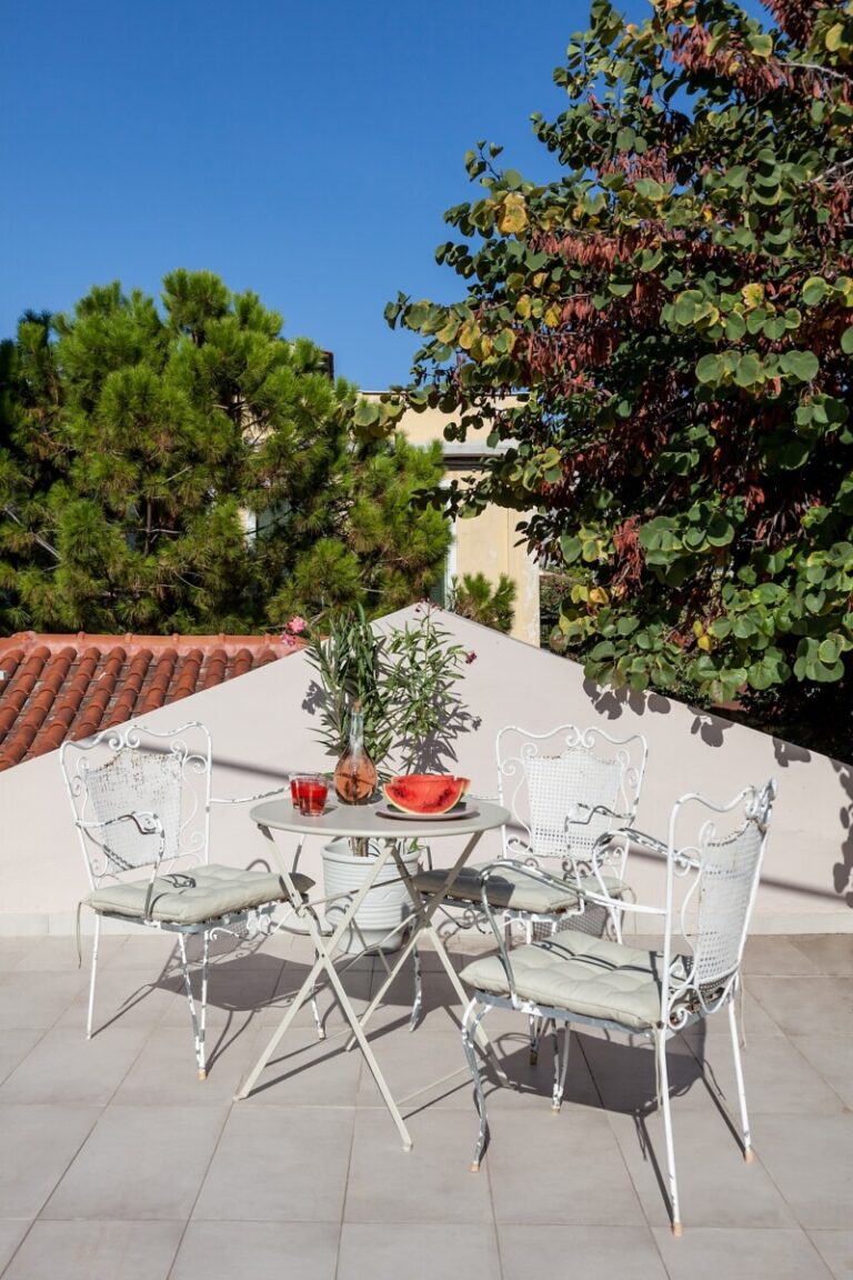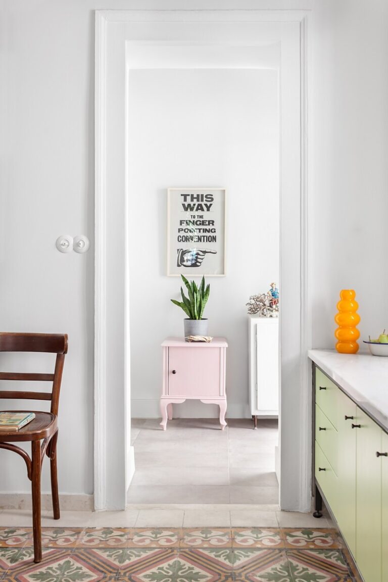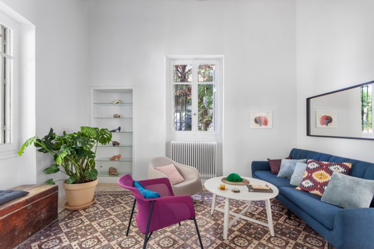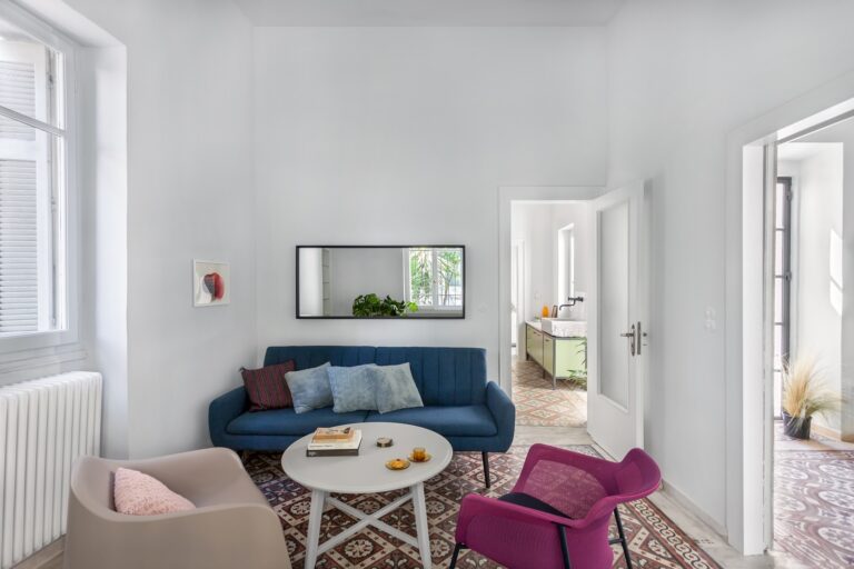Στο δεύτερο σπίτι, τα παραδοσιακά πλακάκια στα πατώματα διατηρήθηκαν και συνδυάζονται με σύγχρονα έπιπλα και έντονες χρωματικές πινελιές, δημιουργώντας έναν χώρο ζεστό και φιλόξενο. Οι καθαρές λευκές επιφάνειες αναδεικνύουν την υφή των υλικών και επιτρέπουν στο φυσικό φως να κυριαρχεί.