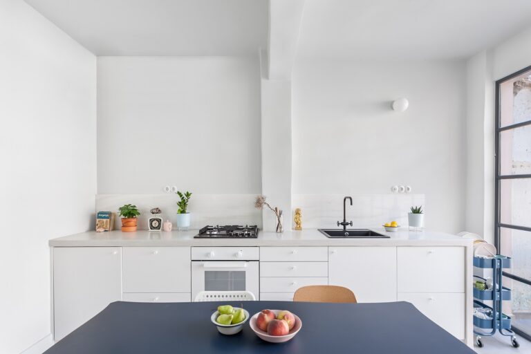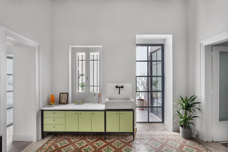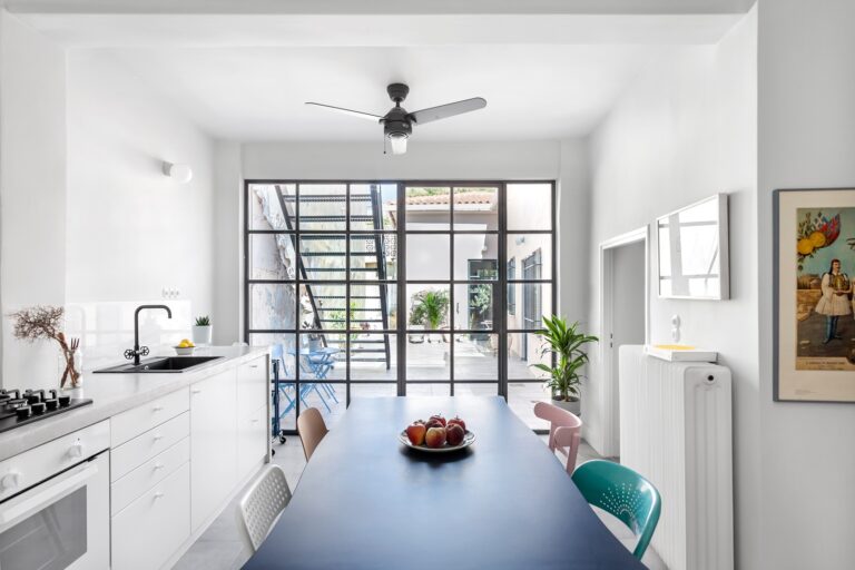 Η κουζίνα και η τραπεζαρία διατηρούν την ίδια λογική απλότητας. Ένας μαρμάρινος νεροχύτης, που προέρχεται από κατεδαφισμένα σπίτια της περιοχής, τοποθετήθηκε πάνω σε μια νέα μεταλλική κατασκευή, συνδέοντας το παρελθόν με το παρόν του χώρου. Τα παστέλ χρώματα στα έπιπλα και τα vintage στοιχεία δίνουν μια χαλαρή, σχεδόν παιχνιδιάρικη αίσθηση.
