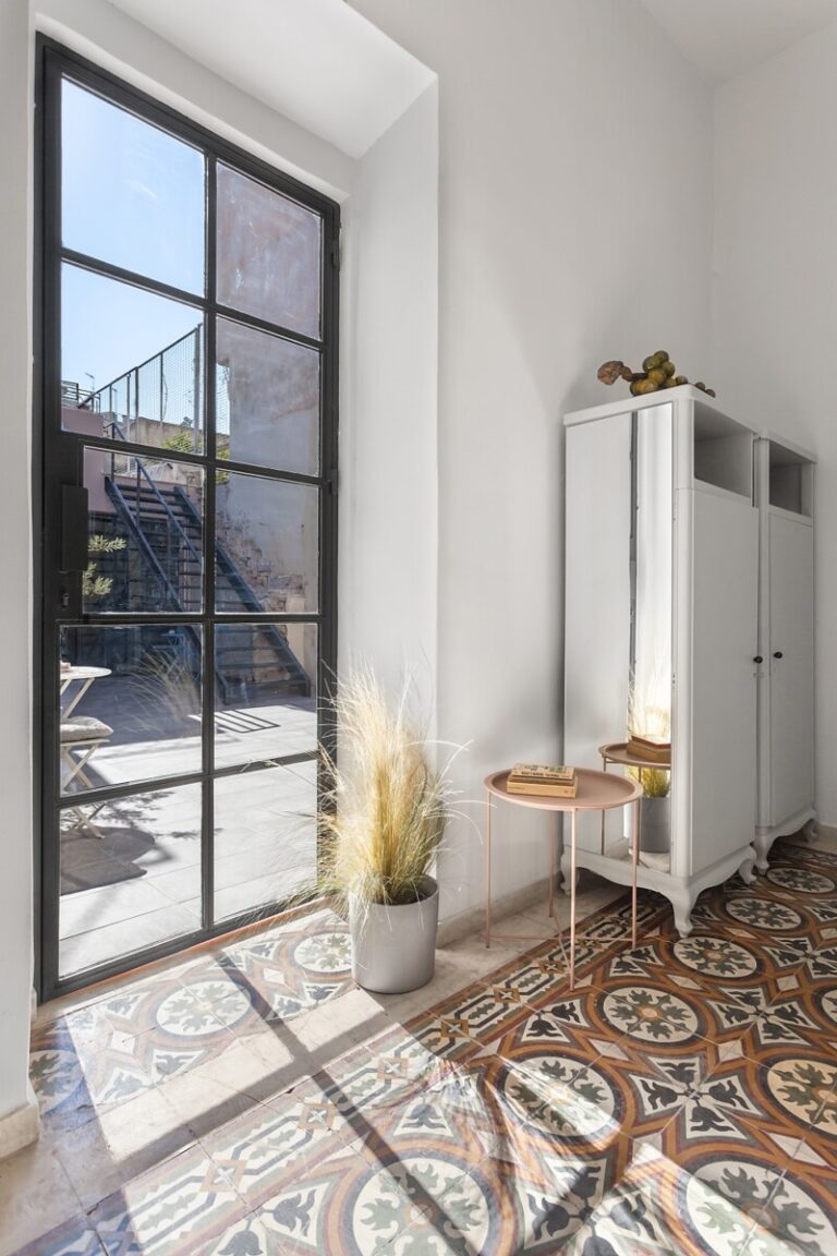 Στο εσωτερικό, η ανακαίνιση ισορροπεί ανάμεσα στο παλιό και το νέο, ενώ τα ψηλά ταβάνια και τα μεγάλα ανοίγματα γεμίζουν τους χώρους με φυσικό φως.
