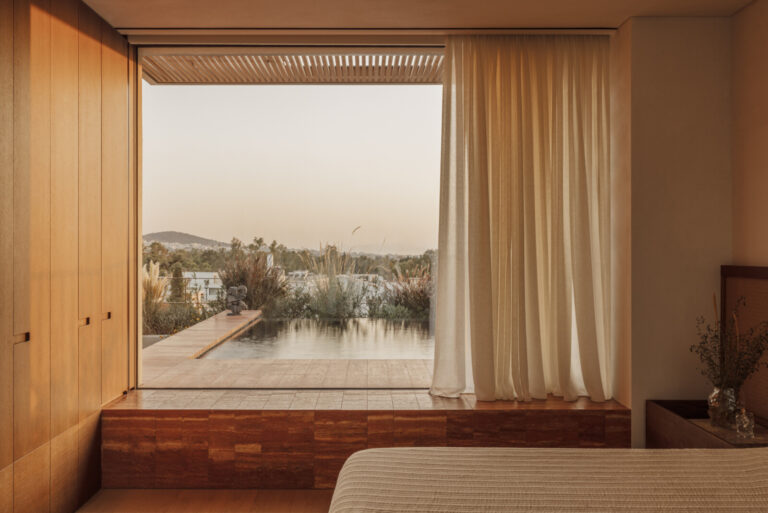 Η αυστηρότητα των γεωμετρικών αρχών μετριάζεται από απαλές καμπύλες, εκλεπτυσμένες ξύλινες λεπτομέρειες και μεσογειακή βλάστηση.