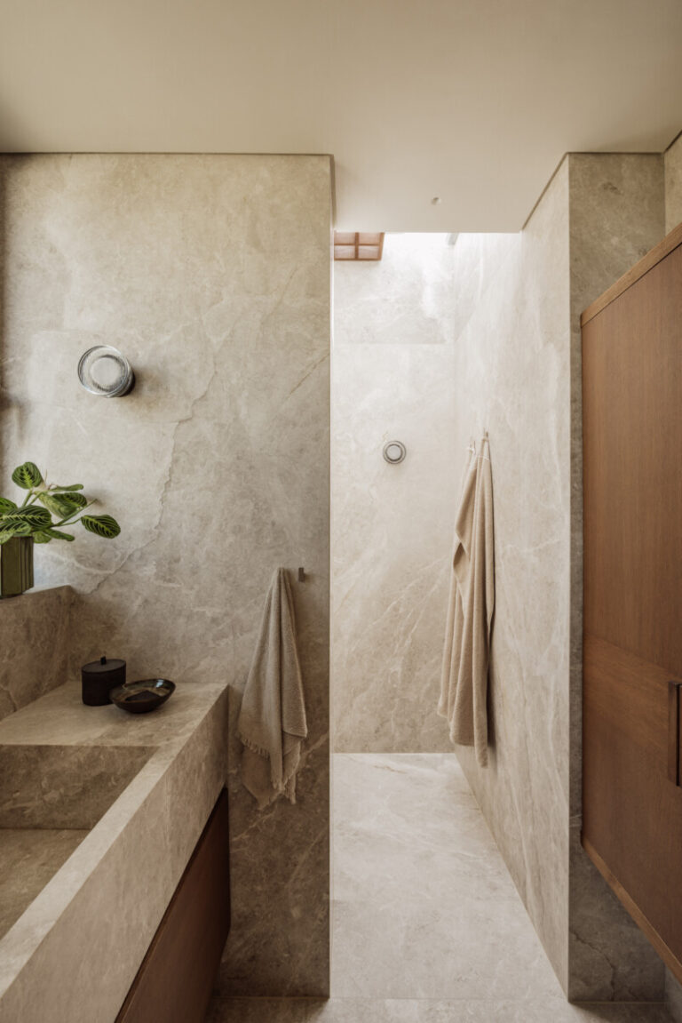 Οι αρχές της ευεξίας και της βιοφιλικής σχεδίασης αποτελούν θεμέλιο της σύλληψης. Τα φυσικά, απτικά υλικά -μάρμαρο, ξύλο, τραβερτίνo, κεραμικά- επιλέγονται όχι για να εντυπωσιάσουν, αλλά για να ζήσουν, να φθαρούν και να αφηγηθούν την ιστορία της καθημερινότητας.
