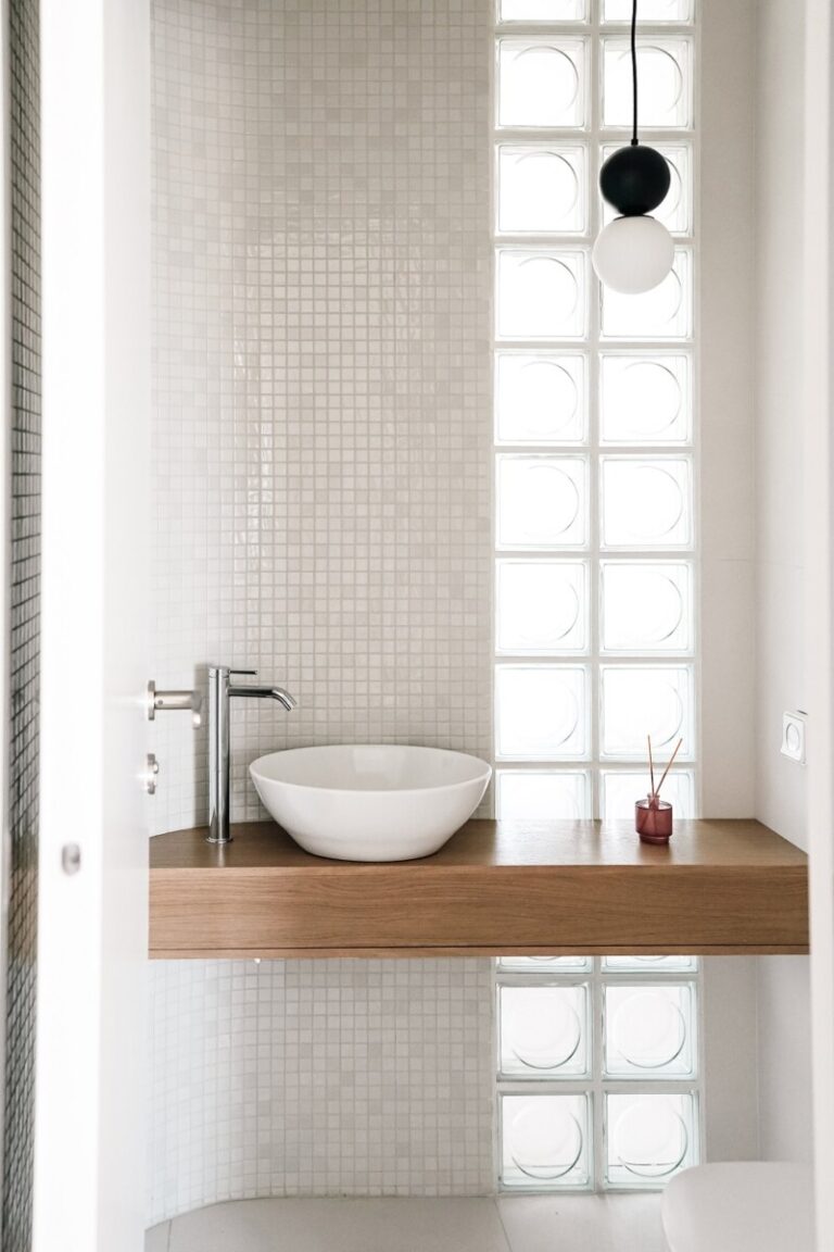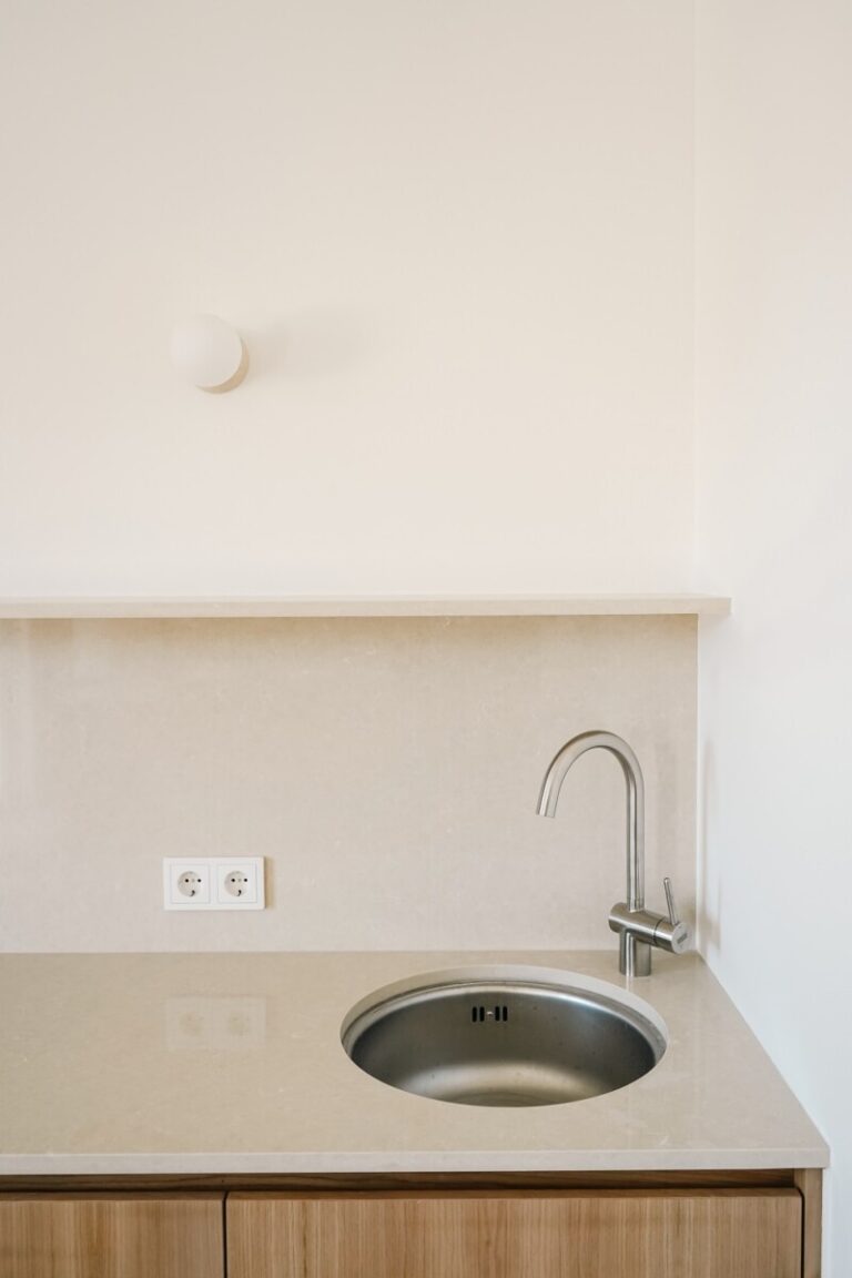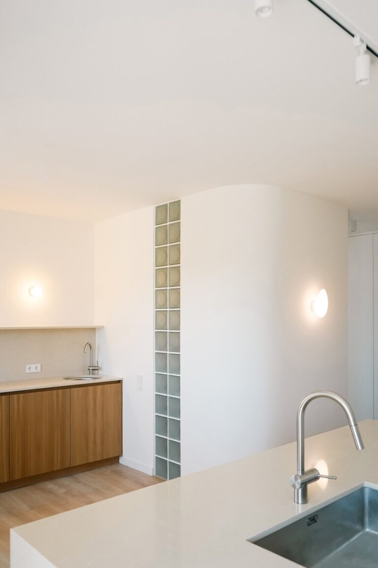 Οι καμπύλοι τοίχοι στους κοινόχρηστους χώρους δίνουν ένα αρμονικό αισθητικό αποτέλεσμα. Υαλότουβλα χρησιμοποιήθηκαν σε λουτρό και WC, για να φωτίσουν αυτοί οι ενδιάμεσοι χώροι στους οποίους δεν υπήρχε παράθυρο.