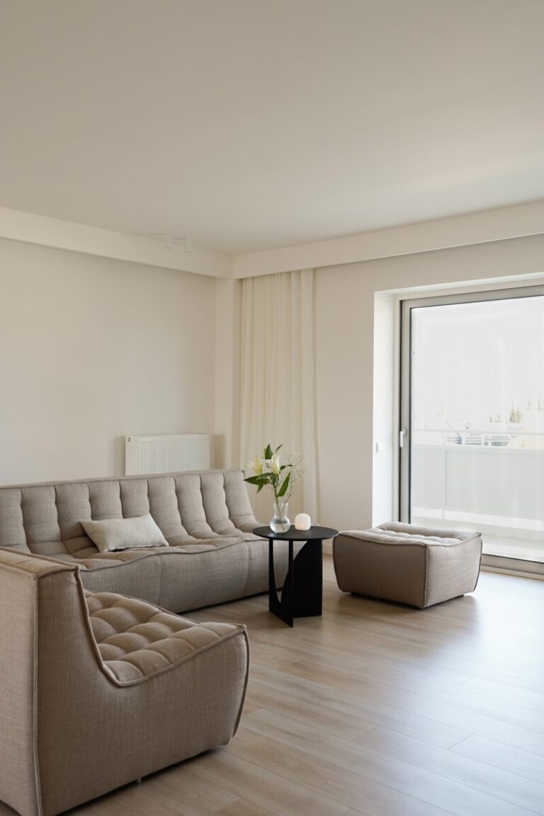 Σε όλο το διαμέρισμα, το δάπεδο καλύφθηκε από laminate σε απόχρωση ανοιχτού δρυ. Στην κουζίνα επιλέχθηκε ένας διακριτικός χαλαζίας σε μπεζ απόχρωση που συμπλήρωσε τη γήινη παλέτα.