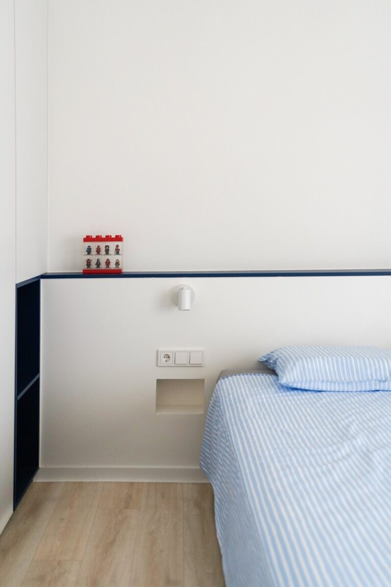 Η κύρια κρεβατοκάμαρα ακολούθησε αυτή τη χρωματική παλέτα, με πλακάκι με όψη travertino στο λουτρό της, ενώ η δεύτερη κρεβατοκάμαρα διαφοροποιήθηκε με έντονο το μπλε στοιχείο - τόσο στα ξυλουργικά του όσο και στο χώρο του λουτρού.