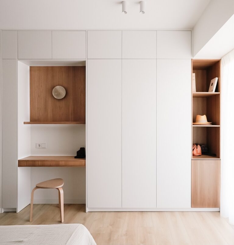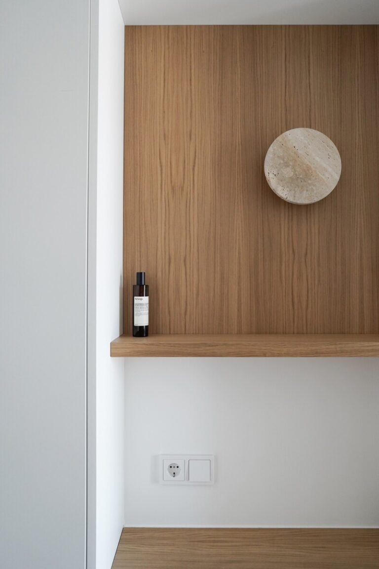 Επιθυμία των ιδιοκτητών ήταν ένα ήρεμο και minimal αισθητικό αποτέλεσμα. Γι' αυτόν τον λόγο επιλέχθηκαν εντοιχισμένες ντουλάπες, κρυφόπορτες και ξυλουργικά στην ίδια off white απόχρωση με τους τοίχους.