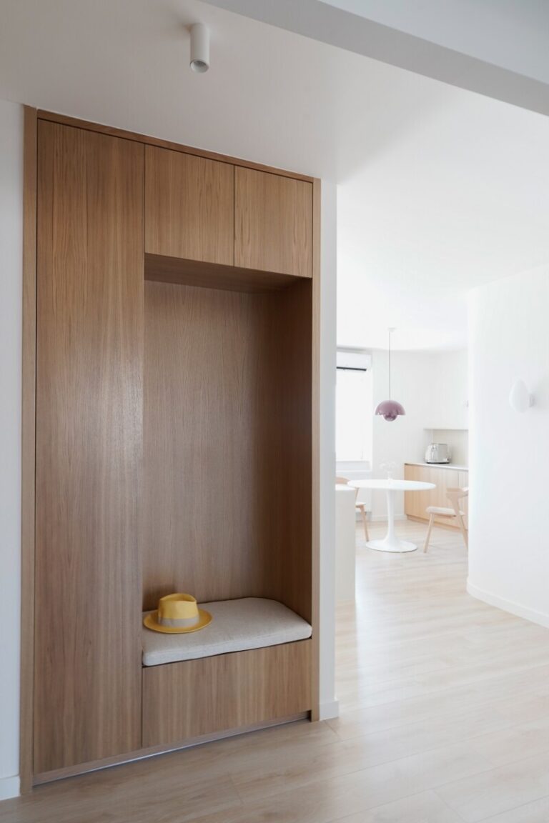 Το χολ ενοποιεί την είσοδο με τον χώρο του καθιστικού και της τραπεζαρίας, ενώ παράλληλα δημιουργήθηκαν χώροι αποθήκευσης, ένα εντοιχισμένο έπιπλο με κάθισμα στην είσοδο και ένα wc.