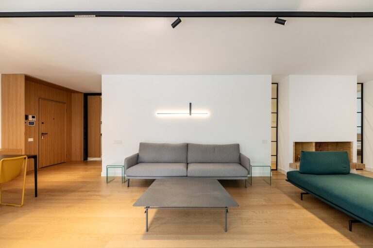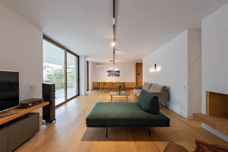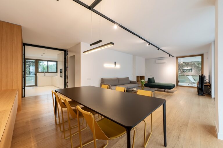Αυστηρή μοντερνιστική γραμμή, τόσο στην κάτοψη όσο και στη μορφολογία, ακολουθεί ένα διαμπερές διαμέρισμα 140 τ.μ. σε μια πολυκατοικία της δεκαετίας του ’70 στο Παλαιό Ψυχικό, ενσωματώνοντας στοιχεία μπρουταλισμού που αντανακλούν την αρχική αρχιτεκτονική κατεύθυνση του κτιρίου.