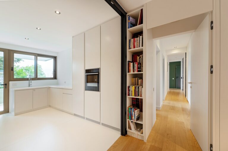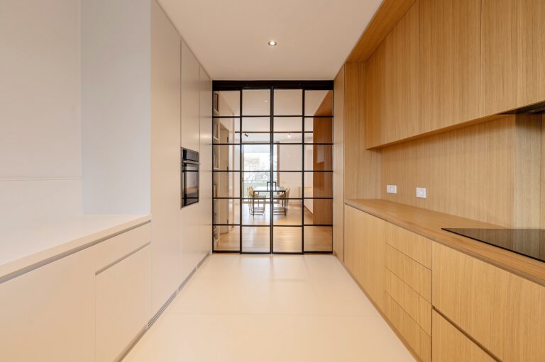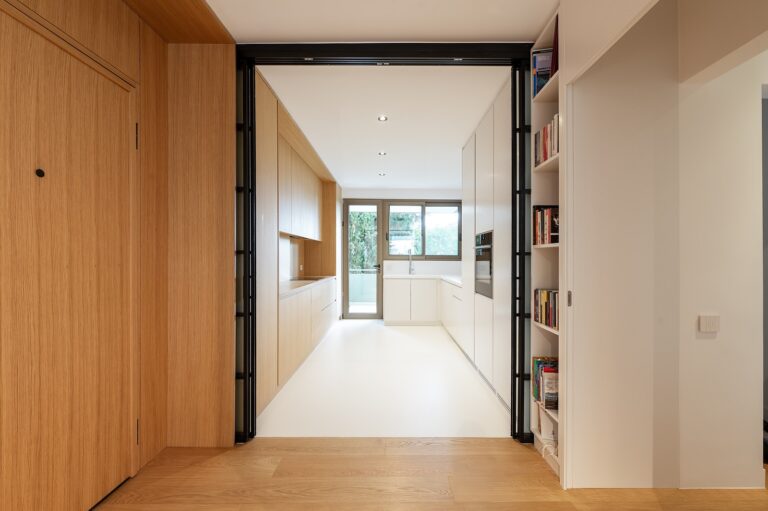 Η κουζίνα, η οποία ήταν ένας κλειστός χώρος όπως όριζε η λειτουργία της εποχής, μετασχηματίστηκε σε ενδιάμεση χωρική κατάσταση μέσα από το άνοιγμά της, με τη χρήση συρόμενου διαχωριστικού υαλοστασίου και την απρόσκοπτη συνέχεια των υλικών.