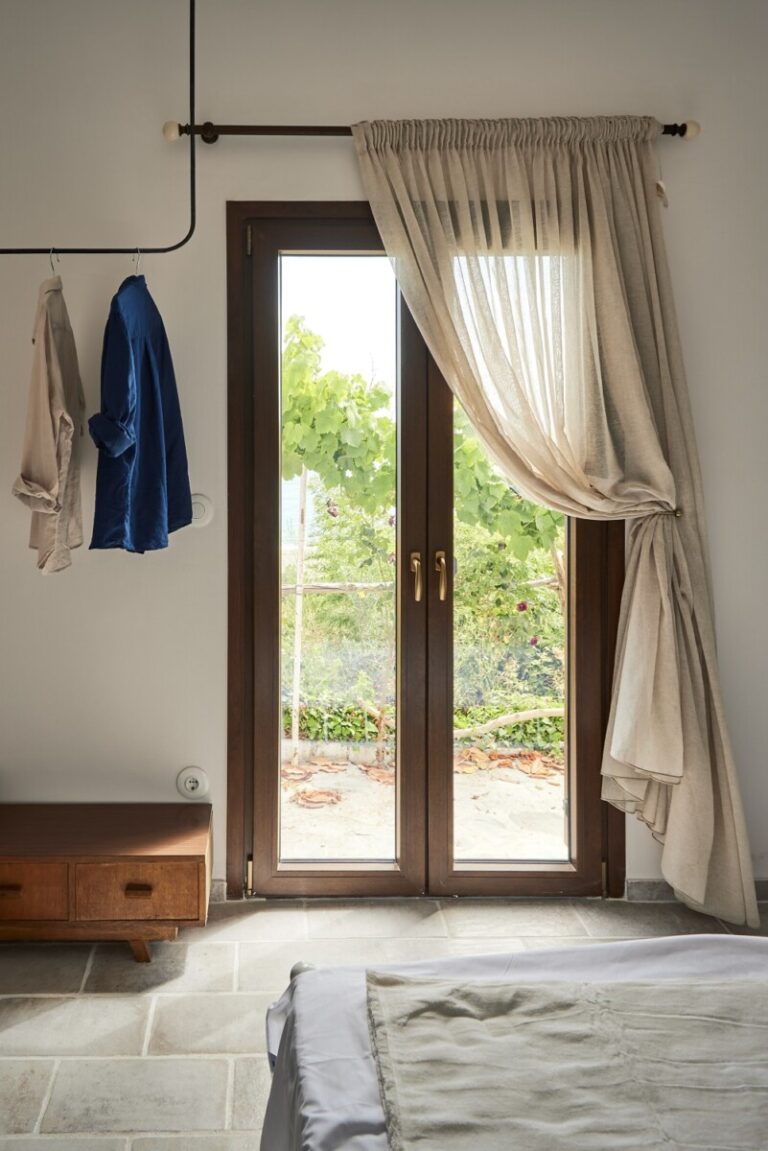 Εσωτερικά, προτιμήθηκαν ελαφριές δομικές λύσεις και vintage έπιπλα επαναχρησιμοποιήθηκαν σε όλο το σπίτι.