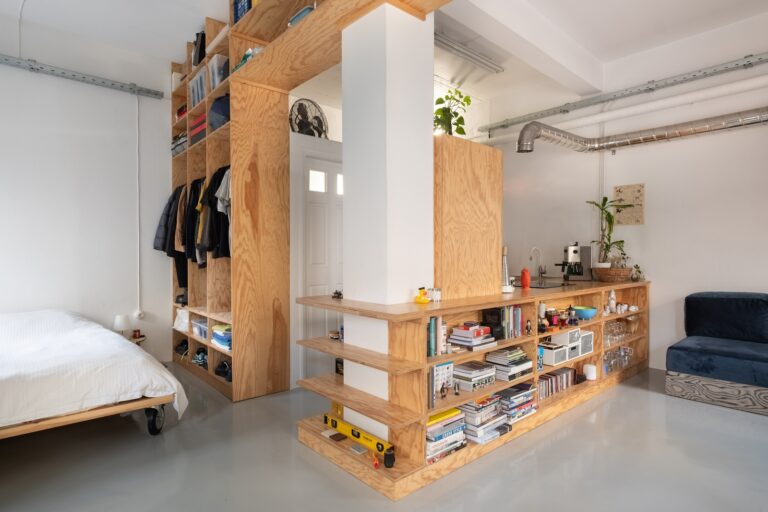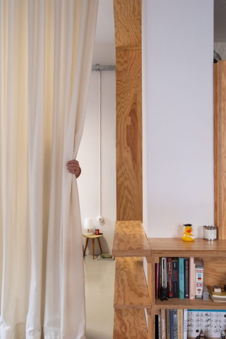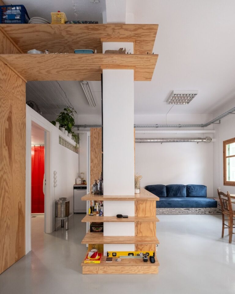 Κεντρικό στοιχείο του διαμερίσματος είναι το διαχωριστικό έπιπλο από κόντρα πλακέ πεύκου, που λειτουργεί ως κουζίνα, βιβλιοθήκη και ντουλάπα, ενώ διαχωρίζει τον χώρο της κουζίνας και του μπάνιου από το υπόλοιπο διαμέρισμα.