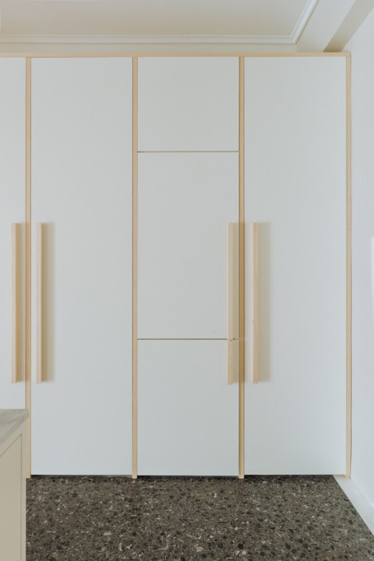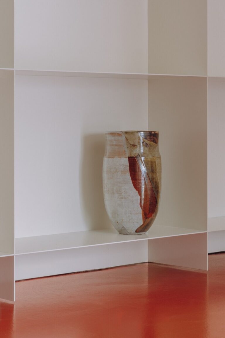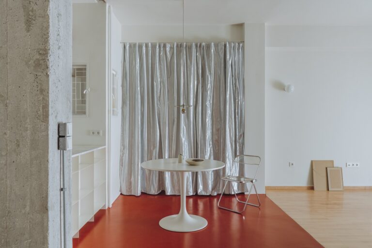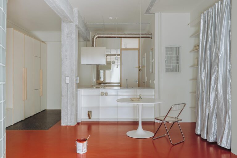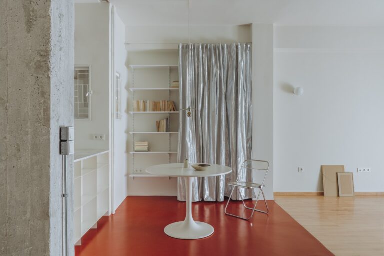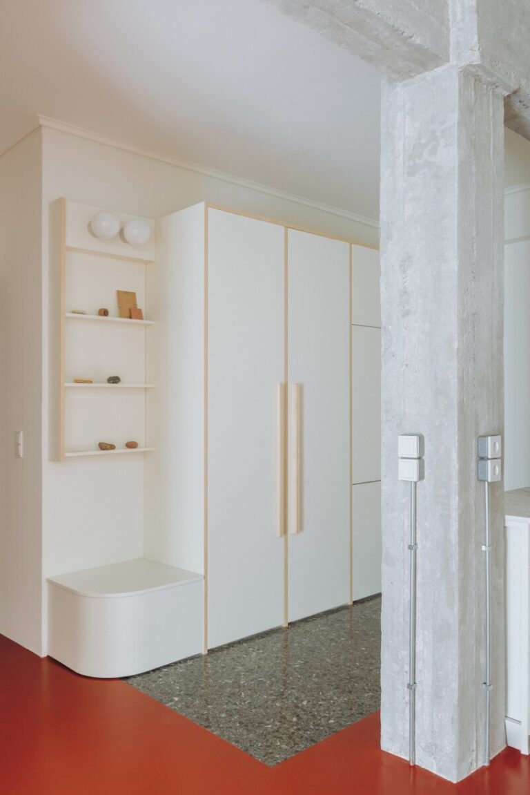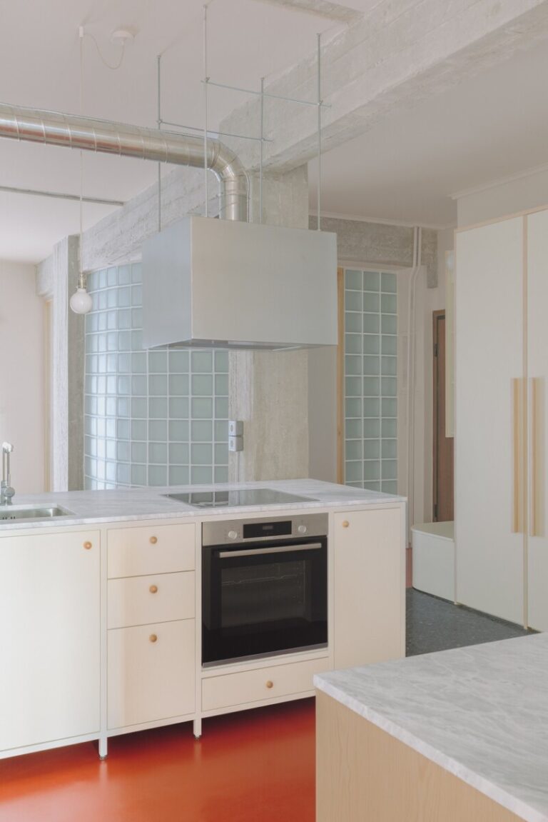 Τα ξύλινα πατώματα αποκαθίστανται και η κουζίνα ξεδιπλώνεται ανάμεσα σε δύο διαφορετικές επιφάνειες. Στο δάπεδο, ένα κόκκινο «χαλί» ορίζει το κέντρο της επέμβασης και υποχωρεί στην είσοδο για να αποκαλύψει το αποκατεστημένο μωσαϊκό.