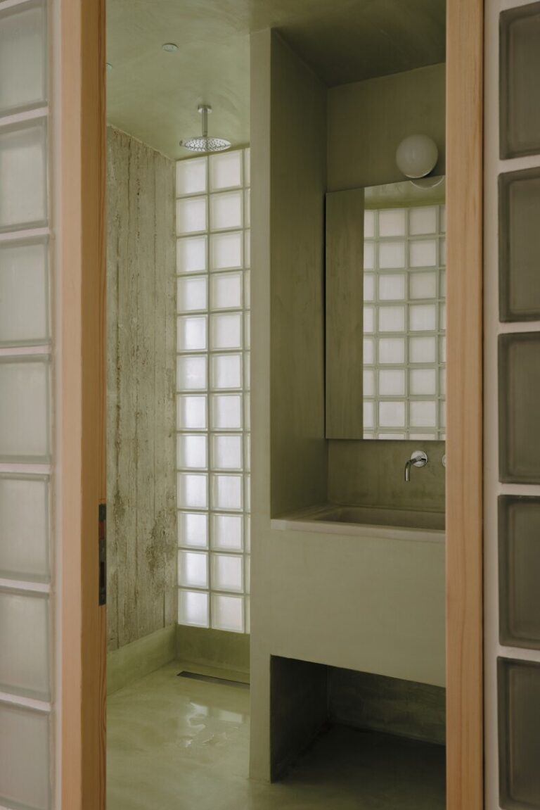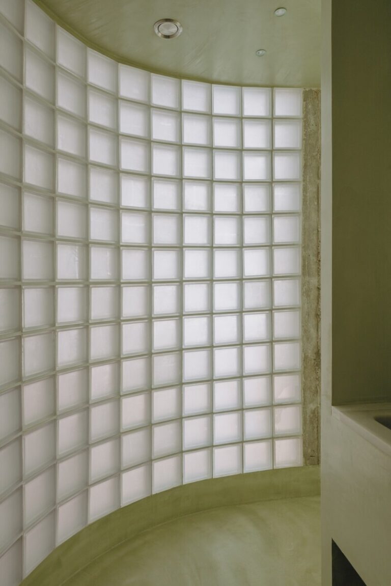 Το κυρίως λουτρό τοποθετείται στο κέντρο της κάτοψης, δηλώνοντας την παρουσία του και ορίζοντας την αισθητική, και προστίθεται ένα δεύτερο, σχεδόν κρυφό WC. Το βράδυ, το λουτρό μεταμορφώνεται σε ένα μια φωτεινή καμπύλη επιφάνεια - μια ήσυχη σκηνοθεσία σκιών.
