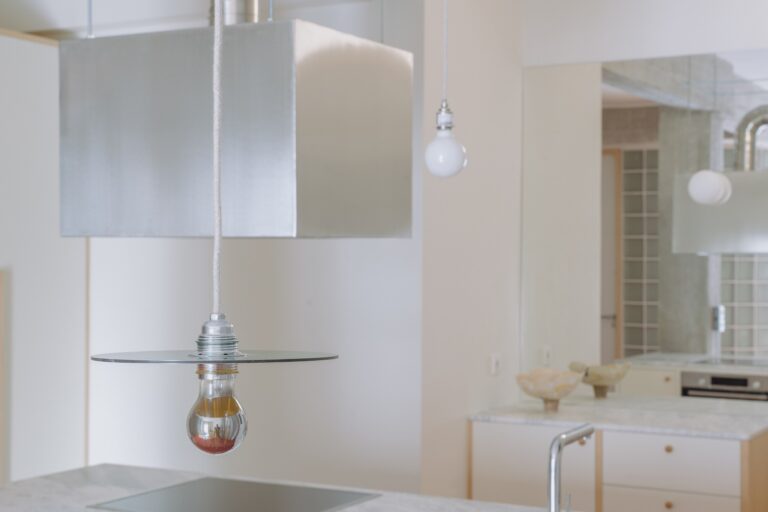 Μια ελαφριά μεταλλική κατασκευή, αιωρούμενα φωτιστικά, ένα υπερμεγέθες «κουτί» για έναν μικρό απορροφητήρα και μια κουρτίνα από γυαλιστερό ασημί ύφασμα, δημιουργούν παιχνίδια αντανακλάσεων κατά τη διάρκεια της ημέρας.