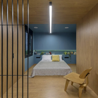 Στην υφιστάμενη εσοχή της ντουλάπας, σχεδίασαν ένα ανακλινόμενο κρεβάτι, ώστε το δωμάτιο να λειτουργεί και ως καθιστικό. Η νέα ντουλάπα κατασκευάστηκε μεταξύ του δωματίου και του χώρου εισόδου. Είναι πλέον ένα πολυμορφικό αντικείμενο που συνδυάζει αποθήκευση, γκαρνταρόμπα, βιβλιοθήκη, εσοχή τηλεόρασης και συρόμενη πόρτα.
