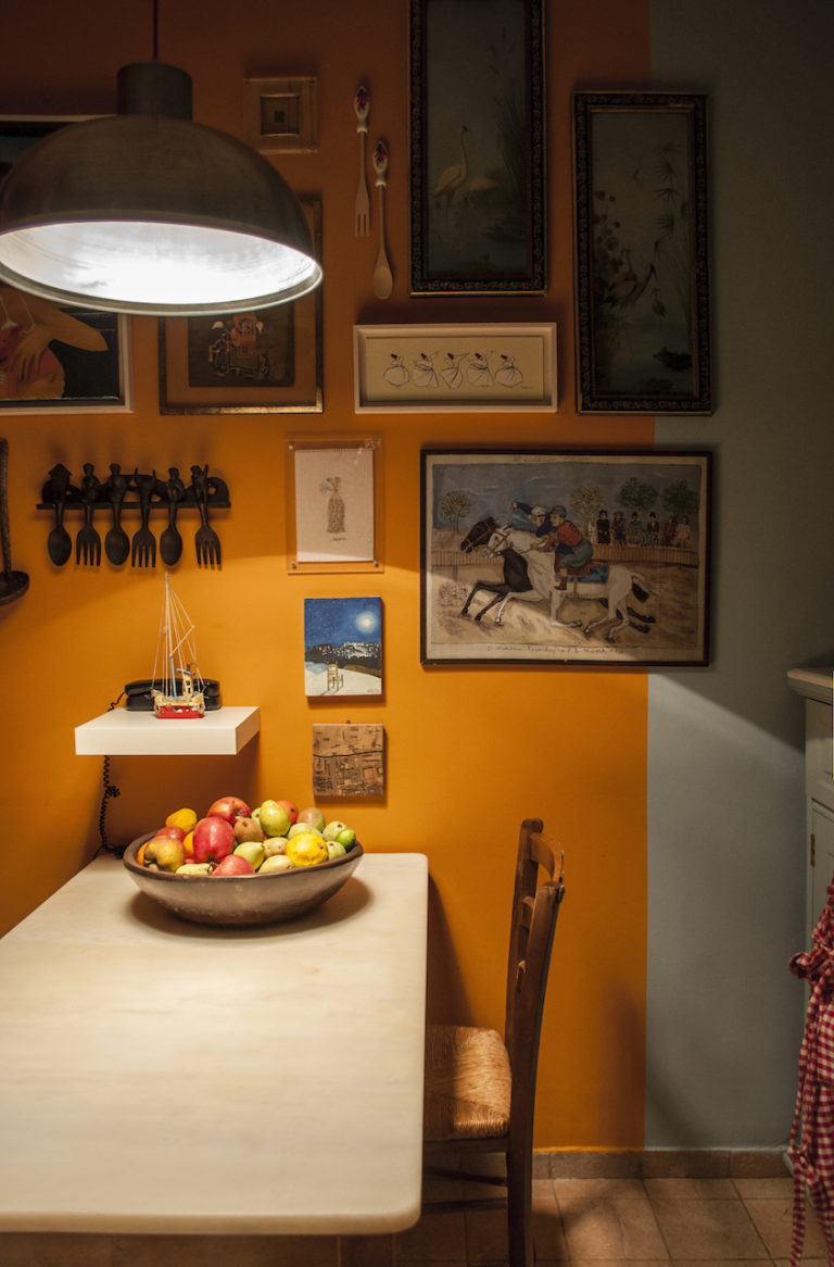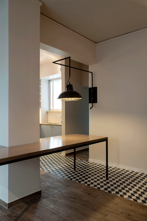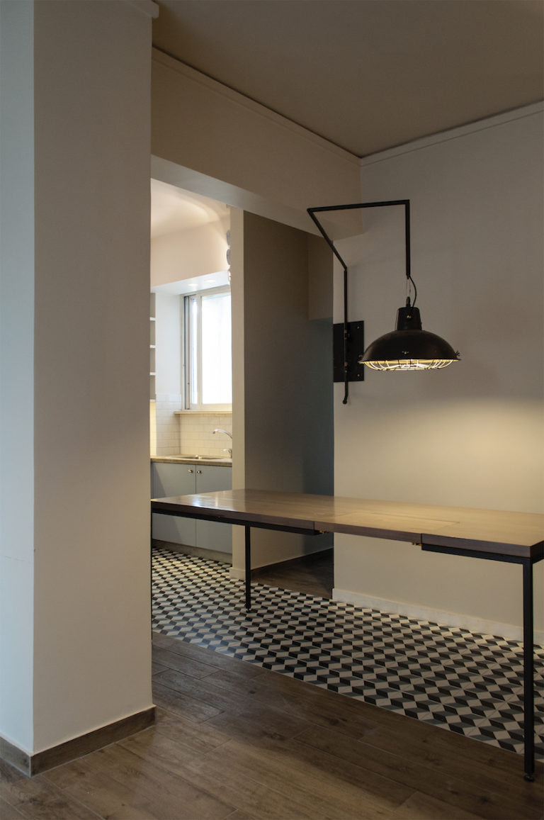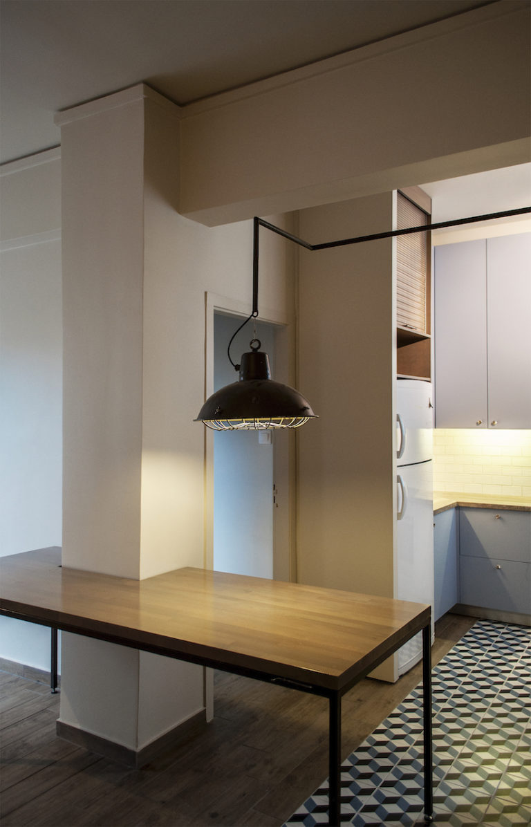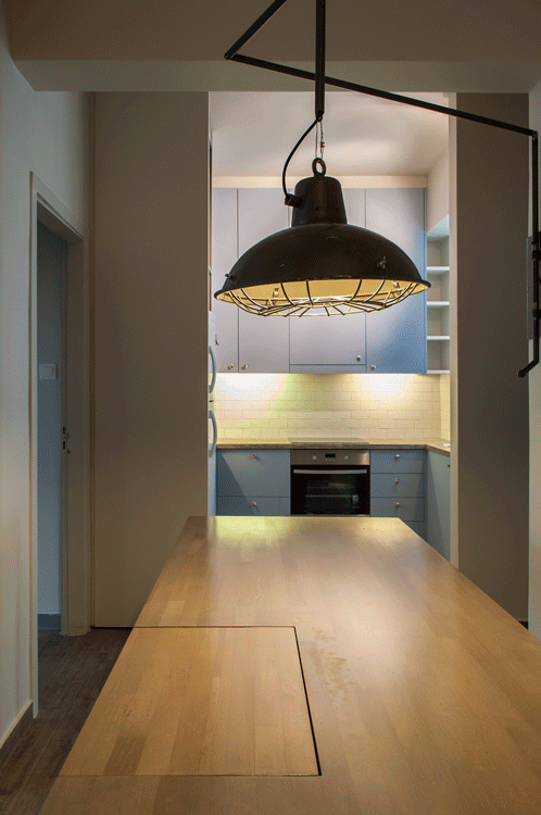 «Βασική χειρονομία για την νέα οργάνωση της κάτοψης, αποτελεί η ενοποίηση της κουζίνας με τον χώρο εισόδου και το καθιστικό, που επιτεύχθηκε με την καθαίρεση τοίχων». Ο νέος χώρος, οργανώνεται με τα στοιχεία ενός τραπεζιού και φωτιστικού, που σχεδιάστηκαν ειδικά για την κατοικία. Και τα δύο αυτά στοιχεία, έχουν μεταβλητό χαρακτήρα, και η μετακίνηση τους, επιτρέπει μια διαφορετική λειτουργία κάθε φορά.