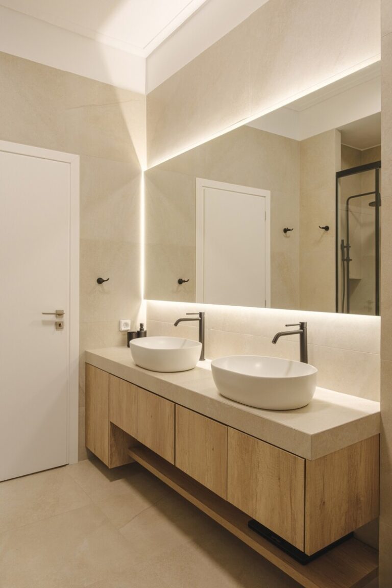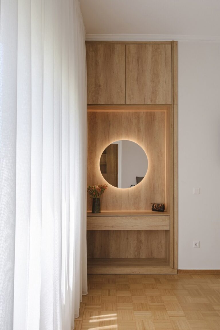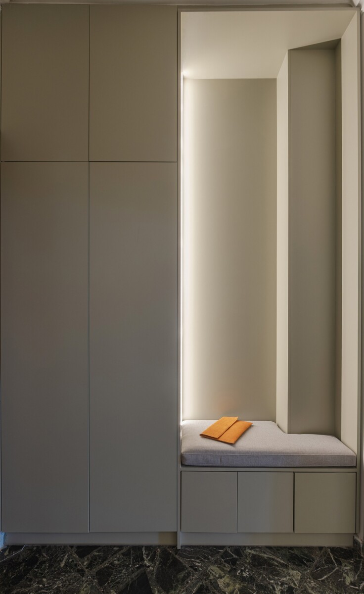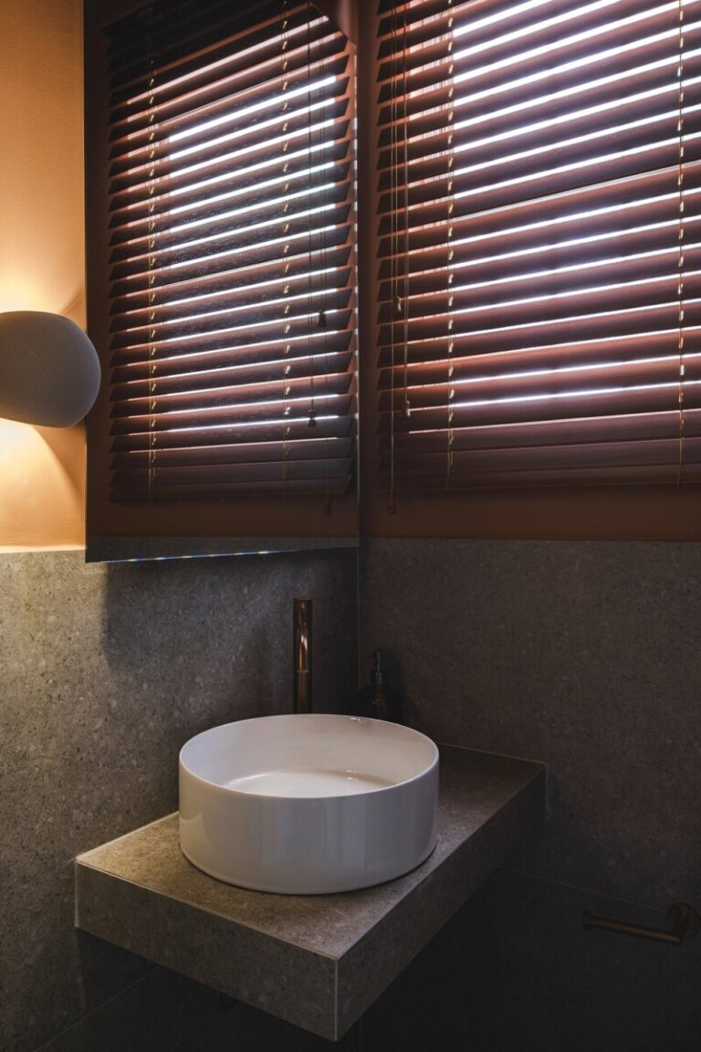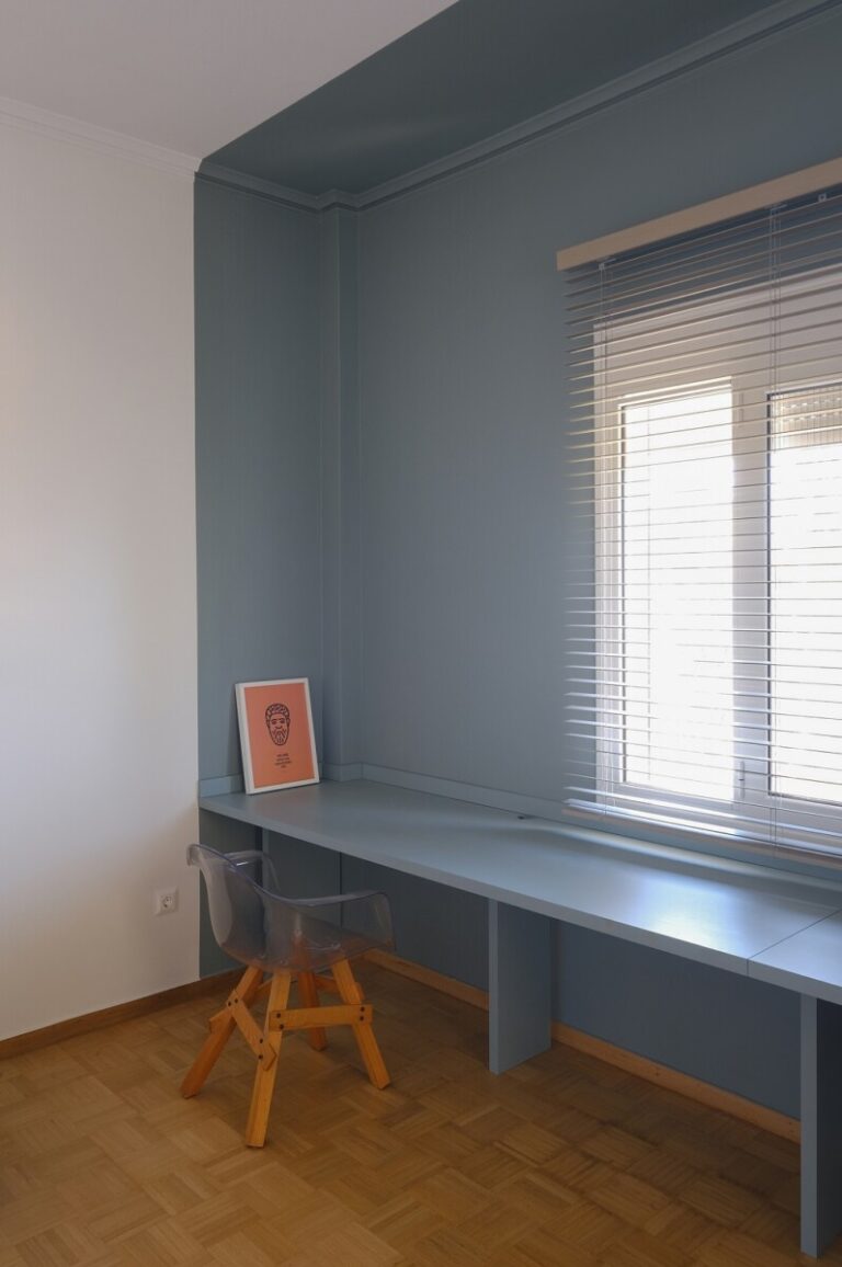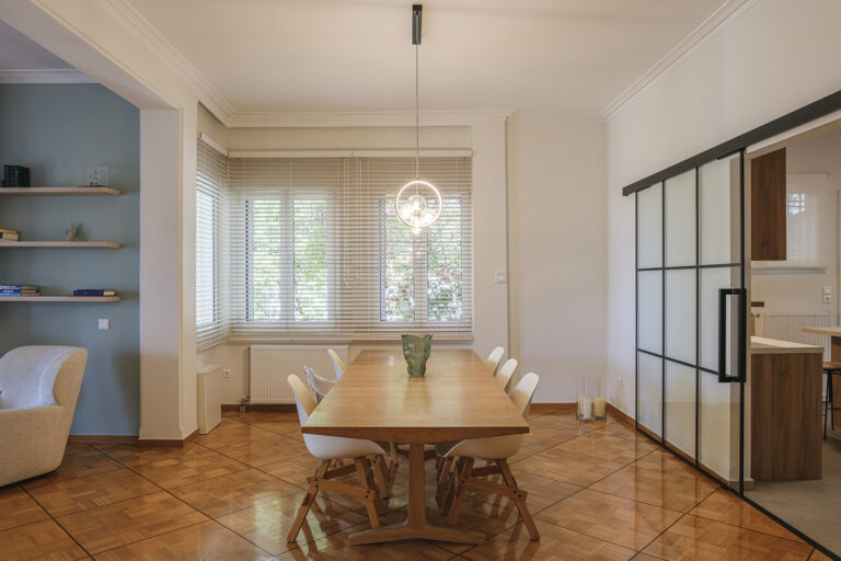 Η μετάβαση από τη μία λειτουργική ζώνη στην άλλη γίνεται ομαλά, με τη ροή των χώρων να υποστηρίζεται από τον αρμονικό συνδυασμό υλικών και χρωμάτων.