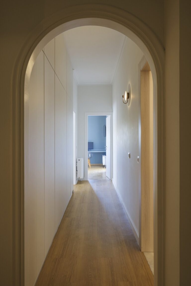 Τα ψηλά ταβάνια του διαμερίσματος και τα ξύλινα πατώματα, τα οποία διατηρήθηκαν και επισκευάστηκαν, προσδίδουν μια αίσθηση φινέτσας και φυσικότητας.
