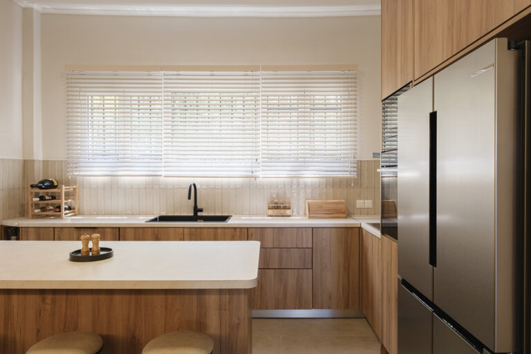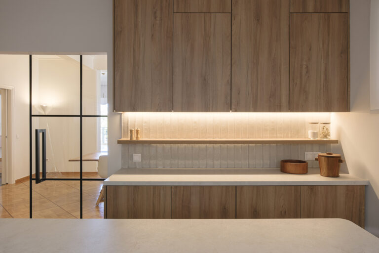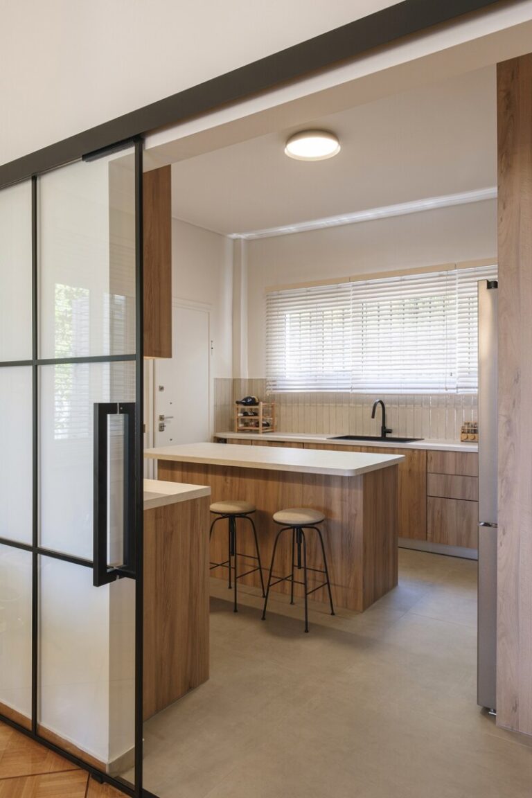 Ανασχεδιασμένη ώστε να καλύπτει τις σύγχρονες ανάγκες της οικογένειας, ενοποιήθηκε με μια μεγάλη γυάλινη πόρτα με την τραπεζαρία και το καθιστικό. Αυτή η διακριτική ένωση των χώρων προσφέρει λειτουργικότητα, χωρίς να χάνεται η αίσθηση της ενότητας και της ροής.