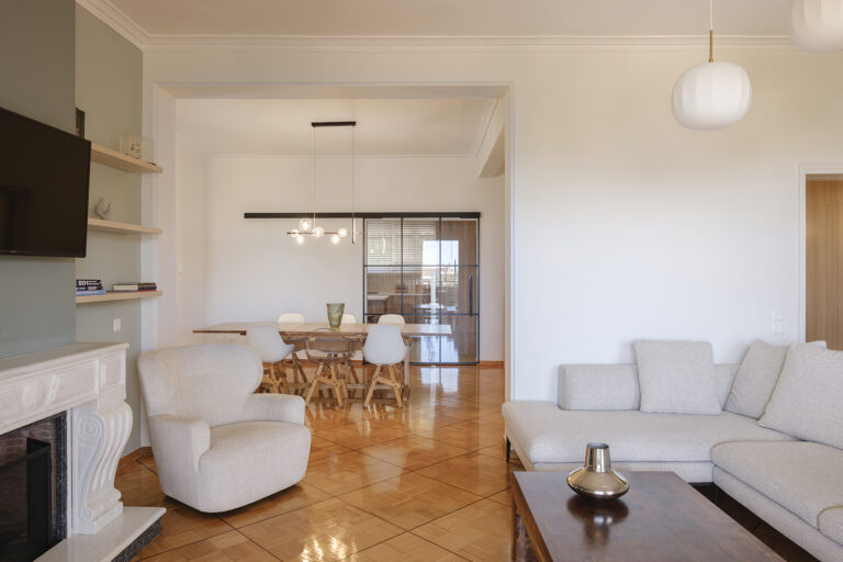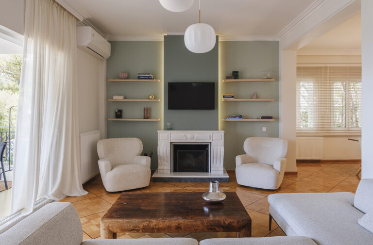 Το καθιστικό, κεντρικός χώρος της καθημερινότητας της οικογένειας, διατηρεί το παλιό τζάκι ως βασικό αρχιτεκτονικό στοιχείο, το οποίο λειτουργεί ως ο κεντρικός άξονας γύρω από τον οποίο οργανώθηκαν οι υπόλοιποι χώροι του σπιτιού.