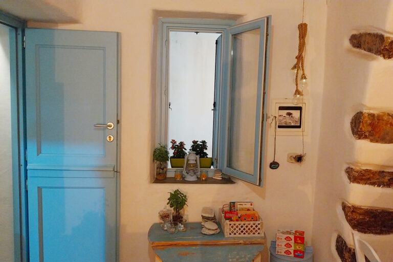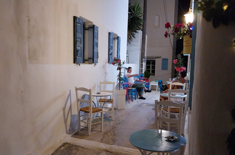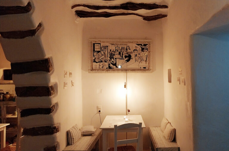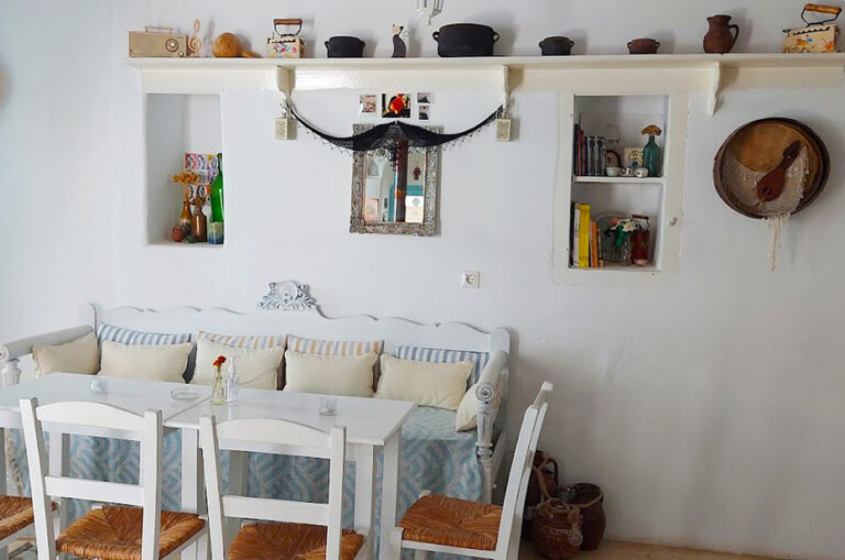 Με τα μικρά τραπεζάκια του στο στενάκι, τα σοβατισμένα καθίσματα με τα κιλίμια στη μικρή αυλή, την ιδιαίτερη διακόσμηση στον εσωτερικό του χώρο με πίνακες, βιβλία και επιτραπέζια παιχνίδια για μικρούς και μεγάλους, παλιά αντικείμενα και μουσικά όργανα και πάνω απ’ όλα, με τον συγκινητικό μαυροπίνακα στον εξωτερικό τοίχο με το όμορφο σκίτσο στη μνήμη της Δήμητρας της Λέσβου.