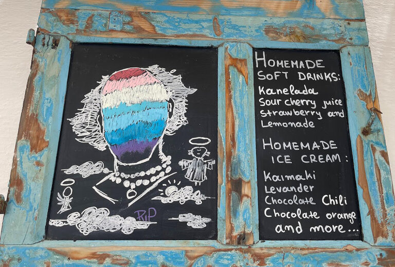 Αυτά όμως που προκάλεσαν οργασμικές εκρήξεις στον ουρανίσκο μας και τα αναπολούμε ακόμη, ήταν οι χοιρινές πανσέτες που αφήνουν το ζουμάκι τους επάνω στις πιτούλες (θα μπορούσα να γυρίσω στο νησί μόνο γι’ αυτό το πιάτο, ειλικρινά) και το χειροποίητο παγωτό. Τι ήταν αυτό; Γιατί δεν μπορώ να το έχω στην Αθήνα; Είναι έγκλημα. Ειδικά το παγωτό Λεβάντα, νομίζω δεν θα το ξεπεράσω ποτέ. Εννοείται θα δοκιμάσετε και άλλες γεύσεις όπως τη σοκολάτα-πορτοκάλι ή κεράσι (βασικά δοκιμάστε όλες τις γεύσεις γιατί κάθε μία χτυπάει διαφορετικούς νευρώνες στον καθένα).